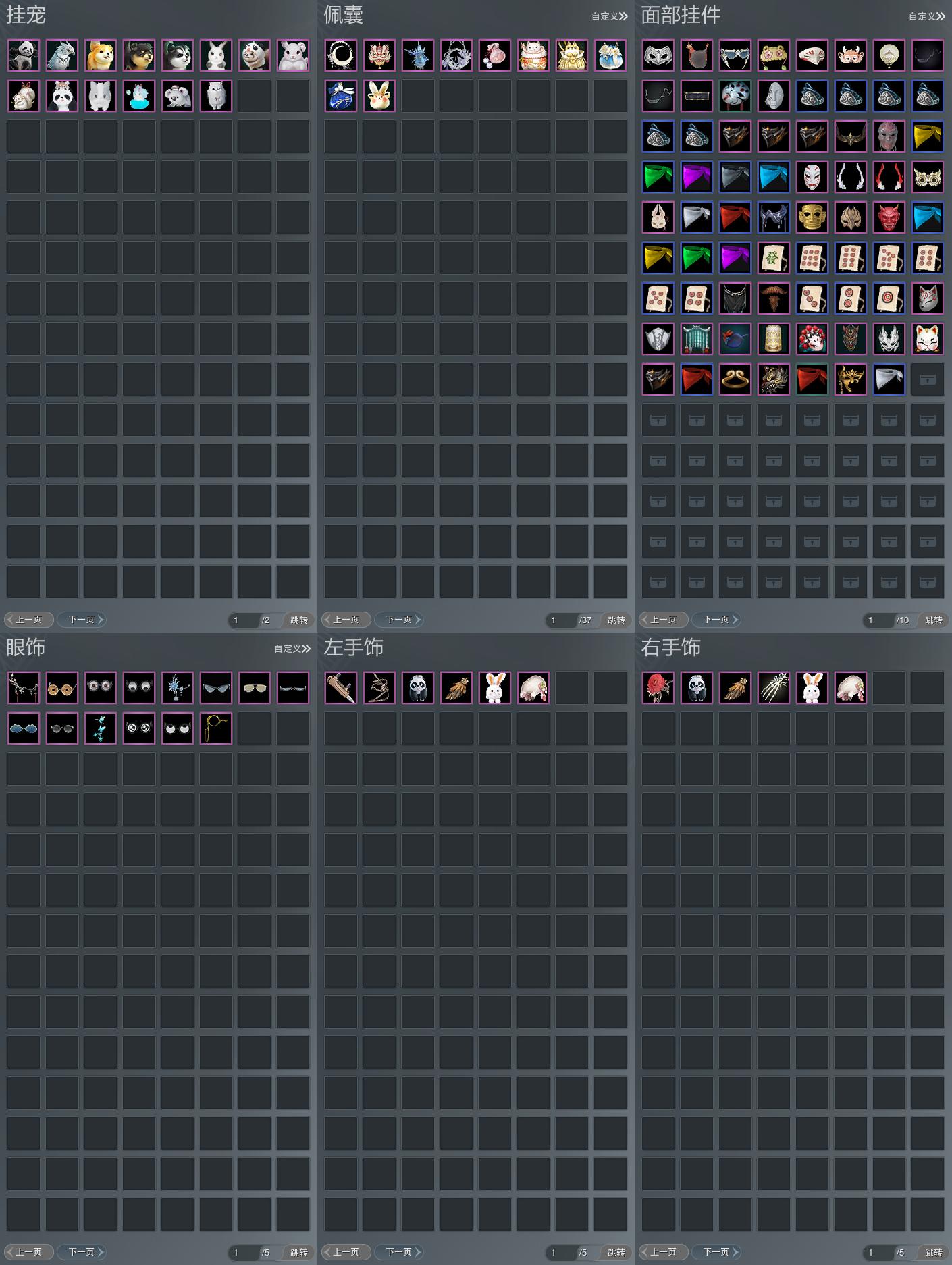 【面挂】71个[镜花浮名, 不见澜生, 梨园面具, 情漪相依, 珠帘面挂, 金箍, 天妒画颜, 狡啮, 返魂, 怀梦, 扶桑, 祈黎明, 神道狐颜, 兔兔面具, 红龙角, 紫龙角, 黑绷带眼罩, 白练眼罩, 夜织眼罩, 大光相面挂]