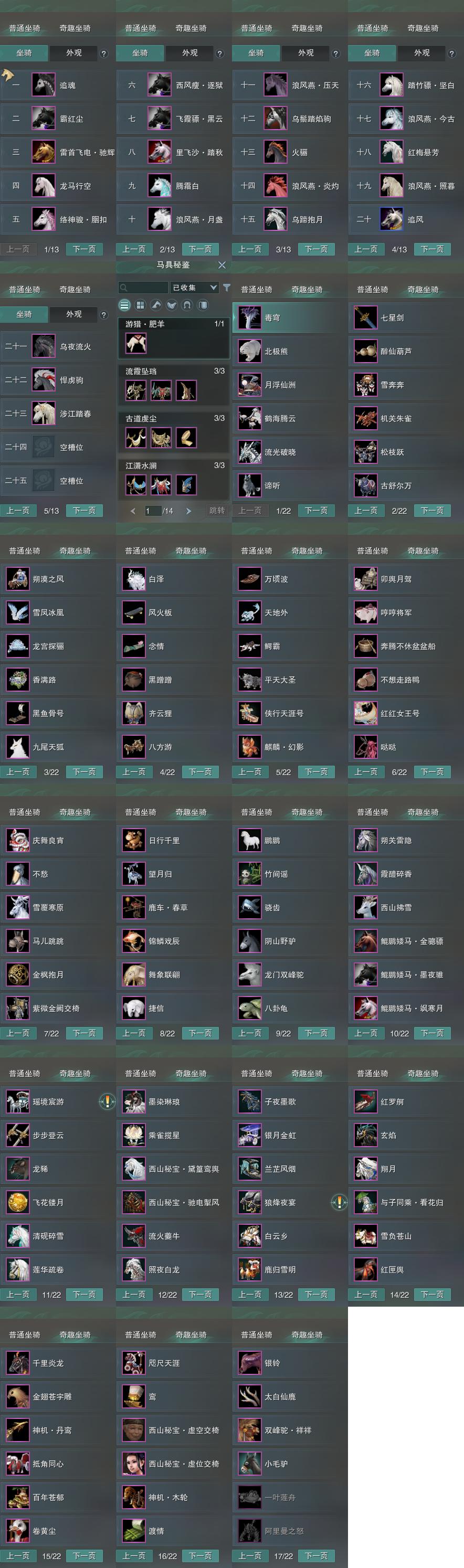 【坐骑】23个[西风瘦逐狱, 飞霞骠黑云, 乌蹄抱月, 里飞沙踏秋, 红马, 白龙马, 踏竹骠坚白, 络神骏胭扣, 浪风燕今古, 霸红尘, 雷首飞电驰辉, 乌鬃踏焰驹]