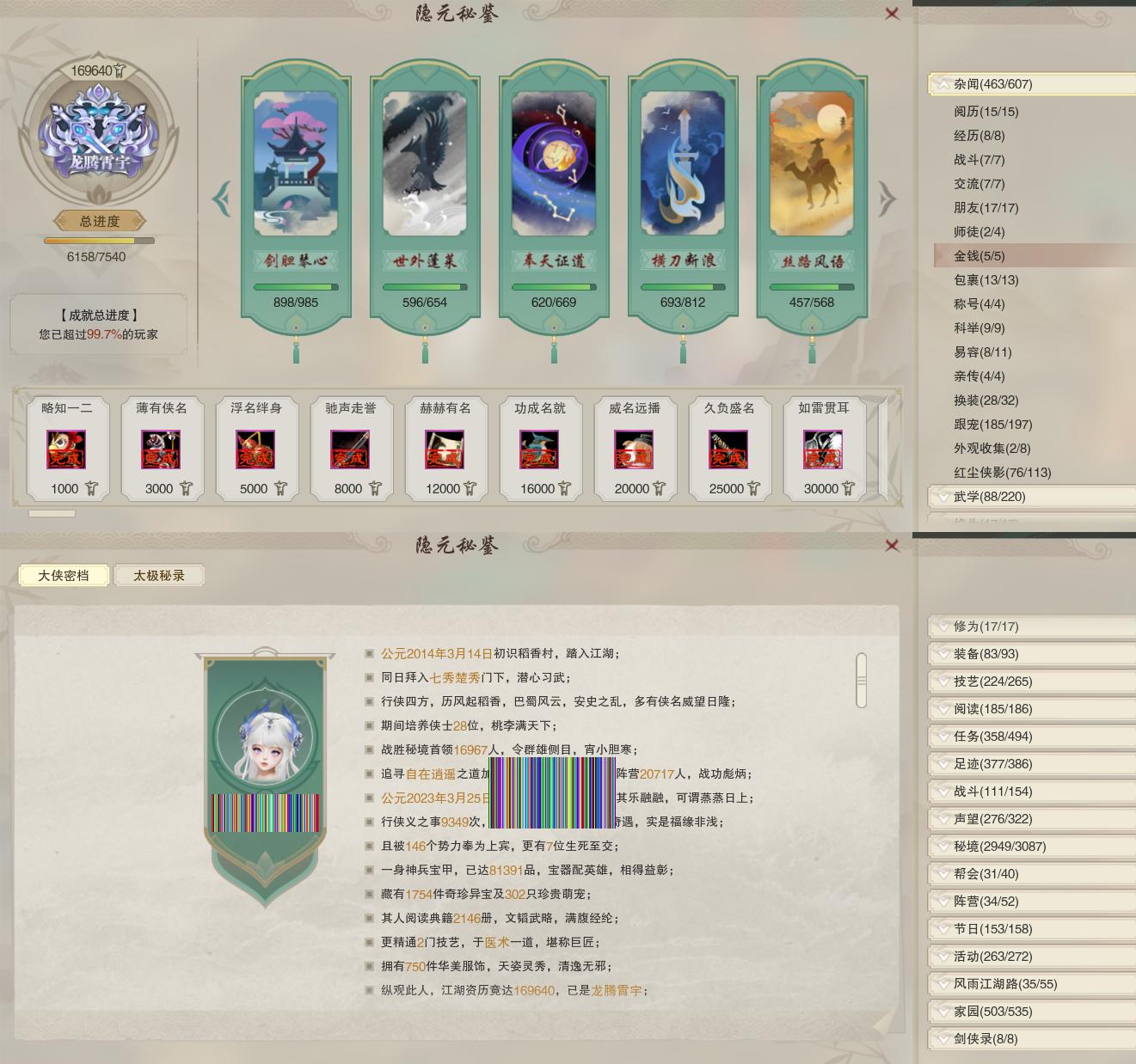 【奇遇】51个[白日梦, 天涯无归, 三山四海, 劝学记, 雪山恩仇, 阴阳两界, 莫负初心, 兔江湖, 平生心愿, 黑白路, 惜往日, 乱世舞姬, 塞外宝驹, 争铸吴钩, 韶华故, 虎啸山林, 济苍生, 护佑苍生, 少年行, 故园风雨, 扶摇九天, 三尺青锋, 流年如虹, 舞众生, 清风捕王, 侠行囧途, 寻猫记, 茶馆奇缘, 入蛟宫, 庆舞良宵]