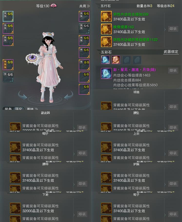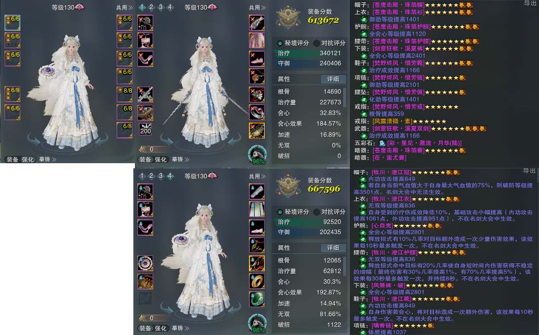 【装备】130级,七秀装备一613672,装备二287328,冰心诀PVE667596