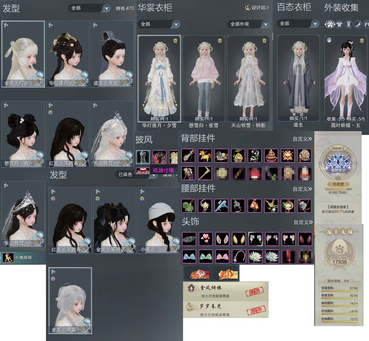 更新白天山盒(黑白发)粉毛衣(黑发)蓝元宵盒(黑发)马红染黑元宵金马年头饰礼包绿/蓝昙花头饰清露金染灰奉清茗金染黑披风*1背挂*10腰挂*8头饰*14奇趣*1头像*2奇遇金风倾楼岁岁春光称号全知PVP61W3/PVE66W7(详情有更新图)