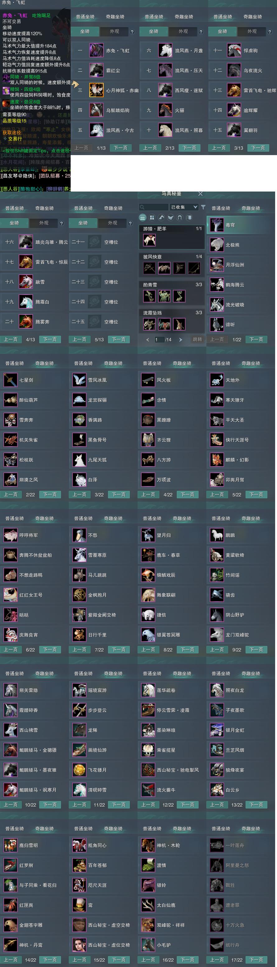 【坐骑】20个[踏炎腾云, 西风瘦逐狱, 恶人狐, 劲足赤兔飞虹, 浪风燕今古, 霸红尘, 雷首飞电惊辰, 雷首飞电驰辉, 乌鬃踏焰驹]