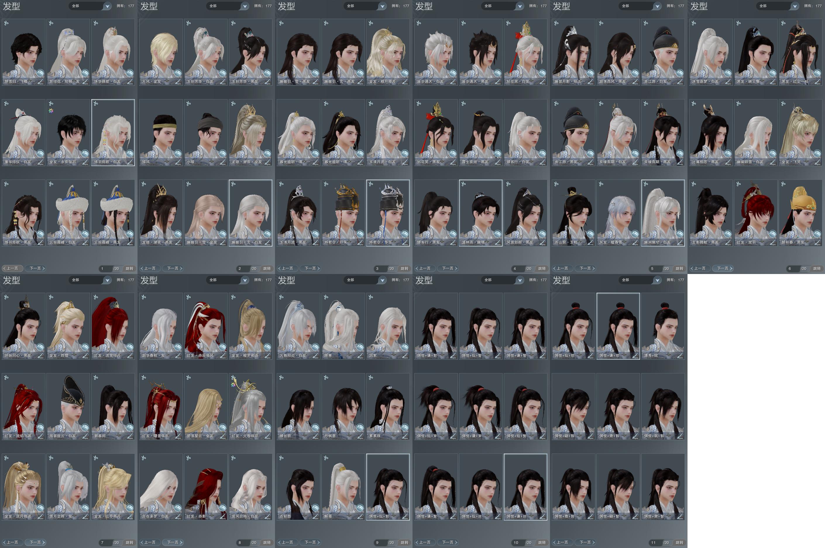 【发型】金发11个[资历金, 国金, 苏金, 倒闭金, 猪金, 飒金, 穆金, 无风金发, 永夜金, 白幽馥金发, 黑龙隐金发], 红发8个[五红, 六红, 八红, 九红, 十红, 猴红, 小资历红, 一代灰], 黑发34个, 白发27个, 盒子发型[曲江游白发, 二代七夕白, 四代七夕黑发, 小白龙黑发, 狄仁杰白, 雪月白发, 五代七夕黑发, 幽阑白发, 十二黑, 花滑白发, 白雨山前黑发, 七七黑发, 曲江游黑发, 七七白发, 白幽昙黑发, 弓盒黑发, 幽涧愀兮白发, 镖盒黑发, 黑傣族黑发, 镖盒白发, 拈花盒黑发, 西游盒黑发, 白持君盒黑发, 八七盒黑发, 拈花盒白发, 白八中黑发, 白幽馥黑发, 西游盒白发, 黑幽馥黑发, 红持君盒白发, 八七盒白发, 黑龙隐黑发, 白八中白发, 黑幽馥白发, 云掠霜峰黑发, 云掠霜峰白发, 络羽黑发, 络羽白发, 蓝毛衣黑发], 总页数11