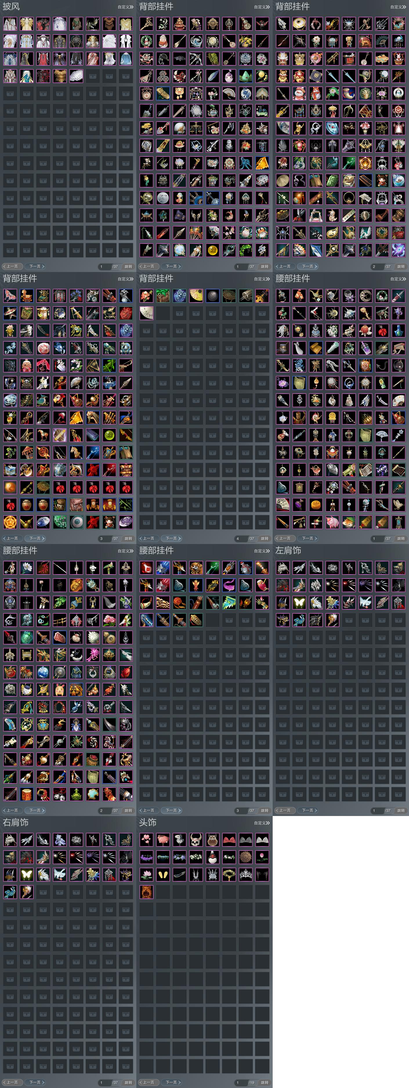 【肩饰】28左,26右,[玄龙夜舞·左, 双鱼曳波·无量·左, 绝代仙·墨楼·左, 云旌望捷·左, 九阙天影·左, 赤羽逍遥·左, 漱玉寒·奇彩·左, 漱玉寒·火绸·左, 漱玉寒·紫殿·左, 漱玉寒·冰青·左, 风刀逐浪·左, 觅花踪·黄云·左, 华焰披锦·左, 鹤影天青·左, 北望天狼·左][玄龙夜舞·右, 绝代仙·墨楼·右, 云旌望捷·右, 九阙天影·右, 漱玉寒·奇彩·右, 漱玉寒·火绸·右, 漱玉寒·紫殿·右, 漱玉寒·冰青·右, 风刀逐浪·右, 觅花踪·黄云·右, 鹤影天青·右, 北望天狼·右]