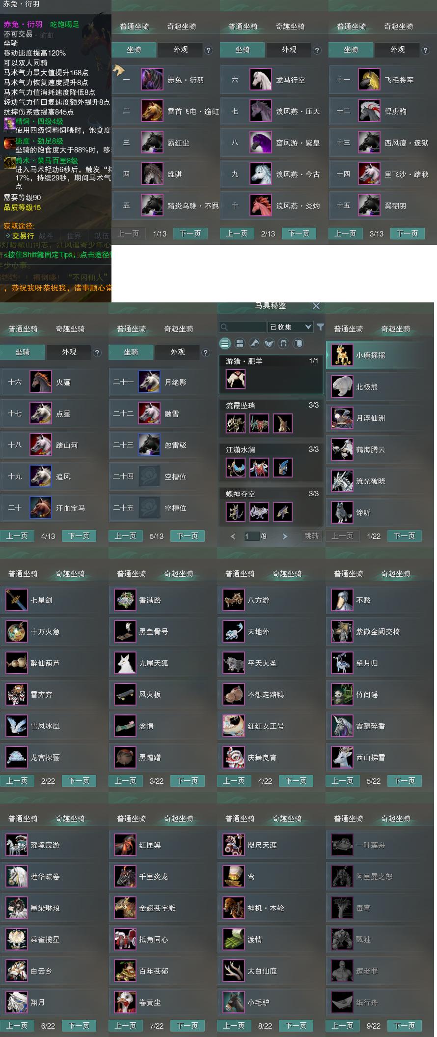 【坐骑】23个[踏炎不羁, 西风瘦逐狱, 飞毛将军, 维骐, 里飞沙踏秋, 劲足赤兔衍羽, 白龙马, 鸾凤游紫皇, 浪风燕今古, 霸红尘, 雷首飞电逾虹]