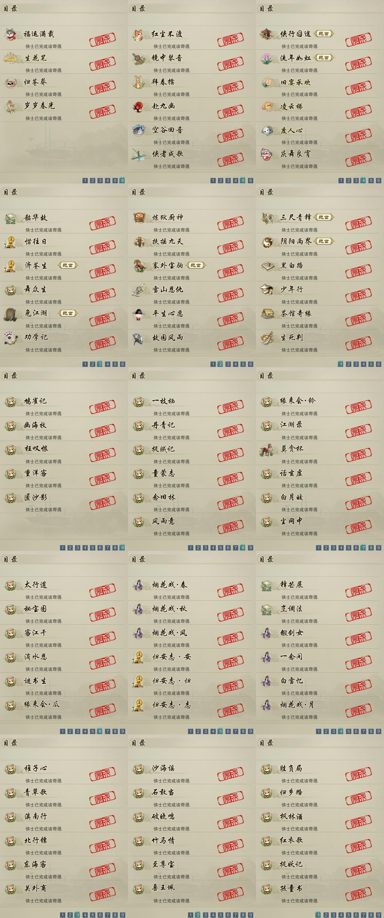 【奇遇】33个[劝学记, 雪山恩仇, 阴阳两界, 兔江湖, 平生心愿, 黑白路, 惜往日, 塞外宝驹, 韶华故, 济苍生, 少年行, 扶摇九天, 故园风雨, 三尺青锋, 流年如虹, 舞众生, 侠行囧途, 茶馆奇缘, 庆舞良宵, 生死判, 凌云梯, 炼狱厨神, 赴九幽, 度人心, 空谷回音, 旧宴承欢, 镜中琴音, 红尘不渡, 侠者成歌, 拜春擂]