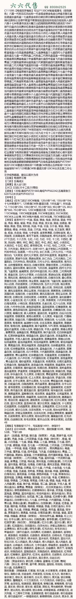 C111095【电信双梦毒姐20w】可过户130CW蜕骨狐狸毛(银饰原色)六翼一代粉五红凤仙粉一代金狐金猴金兔金山神盒衣踏云盒丝路盒狄盒叽盒一七盒黑金夜斩白紫白菜白螺母蓝螺母红玉蟒情阅6五限粉公主绿不欺蓝不欺黄娃娃蓝娃娃粉娃娃白娃娃粉人面9六限十七W奇遇书滚滚大雕三山四海阴阳两界黑白路资历18W1端午白盒衣白凤舞衣红曲塘衣蓝曲塘衣金琼枝衣紫游园衣粉游园衣白游园衣紫桃花衣白明光衣竹笛盒衣蓝海岛衣红竹影衣绿水袖衣蓝水袖衣花滑盒衣蓝忘川衣粉忘川衣红人间盒衣黑人间盒衣绿人间盒衣黄人间盒衣星辰盒衣白雨山衣七中白盒衣绿幽昙衣金幽昙衣黑幽昙衣红幽昙衣绿傣族衣蓝椿山衣白幽馥衣黑月下彩陇西成衣粉陇西成衣蓝陇西成衣灰陇西成衣紫陇西成衣红寻香盒衣蓝故梦衣红蝴蝶衣红浮光金波斯衣黄云香衣蓝云香衣红云香衣紫云香衣白天山衣白赵云衣黑端午盒松间盒秃盒二代花朝盒红盒狗盒歌盒喵盒小白龙盒猪盒棋盒二七盒旗袍盒三七盒四代七夕盒蘑菇盒粉盒五七盒一代乘风盒二代粉盒二代乘风盒蓝盒一中粉盒貂盒红腿盒黑凤舞盒毒盒三中盒蓬莱盒灯盒四中蓝盒飞天盒白菩提盒青盒二代重阳盒黑谪仙蓝鼠盒三代紫重阳盒四代重阳紫盒苍盒白如归盒二代元宵盒丐盒蓝如归盒一代花朝白盒澡盒新青盒刀宗盒棉袄盒黑玲珑盒白琼枝盒三代元宵盒蓝玲珑盒樱花盒沧海盒白楼兰盒唐风玉壶盒黑楼兰盒黑四元盒黑狮盒白狮盒红六七盒六中盒小金龙盒七七盒小熊盒龙盒孔雀盒龙吟盒芙蓉盒莲台盒白海岛原色异域盒黑海岛蓝异域盒蝴蝶盒星源盒白忘川盒羊盒红懒猪狼盒箜篌盒二代毒盒雏菊盒白雪人盒镖盒兔盒咩盒紫人间盒蛇盒除夕盒卿酒盒蓝钻盒不良人盒紫雨山盒踏青盒青霄盒红白妖龙盒红黑妖龙盒原色猪猪响白猪猪响莲华盒灵龙盒虹猫盒蓝兔盒圆舞盒蓝沧州盒粉沧州盒紫沧州盒黑沧州盒白幽昙拈花盒策二盒西游盒红持君令黑傣族盒白持君令八七盒白中秋盒六代重阳盒万灵盒青山盒黑椿山盒黑幽馥白龙隐天星盒红香盒游龙盒婚纱盒粉鹿盒海阔盒熊猫盒茄盒白观灯盒妙乐盒梦盒九七盒兰陵盒黑鹭盒白鹭笠盒白蛇盒青蛇盒柿盒红上火白千山黄千山白陇西燕月盒紫寻香墨龙盒瑶华盒红故梦红故梦蓝蝴蝶盒重花游盒潮涌盒络羽盒仙剑盒苍二盒瓷盒云间盒发财盒蓝洛神盒傀儡盒蓝沙丘红沙丘紫沙丘渡我盒十七盒白战国红战国玉璃盒白浮光涉烟尘流徵涉烟尘清商瑶台仙梦礼盒魔镜盒紫天山粉毛衣红毛衣绿毛衣兰庭金烬紫舞步黑枕戈点寒星映涟点寒星沉玉白泳衣黑泳衣黄泳衣蓝泳衣蓝水母粉水母万川青绿黛瑾风露晓白白菜罗姆烁金黑潇湘沧海间缥缈银罗姆策马雪月复刻黑玫瑰绿白菜罗姆婵娟复刻白玫瑰红白菜罗姆太玄420限486成衣QR枕17W资历披风14W资历披风三山披风奇遇披风幺蛾子天辉92披风七红八红九红十红十二红十四红紫发羊红猴红鼠红牛红虎红兔红小资历红大资历红十五红紫寻香红发蛇红蝶粉十六红马红龙女金资历金鼠金中秋金鸡金蝶金喵金考金狗金猪金丝路金珊瑚金飒金苍金如归金凤金牛金云金女仆金雪金海金蔷薇金穆金水母金龙金三代金一代灰十八万灰雪月白发蓝异域白发二代灰三代灰金原色异域白发劲足赤兔飞虹小樱马金羁驰逐霸红尘雷首飞电惊辰雷首飞电驰辉追魂骨兔江湖莫负初心塞外宝驹争铸吴钩济苍生三尺青锋流年如虹侠行囧途万灵当歌入蛟宫千秋铸飞行马车团团丸子萌萌情漪相依天妒画颜恶人弓玫瑰挂件珠盏映粉蕊兔尾金眼镜银眼镜倜傥意气白兔包蓝兔包猫包PVE70W1拓印120CW墨语沉香拓印110奇遇CW煞昆山玉碎拓印110CW烛幽宠物1W7/120奇遇CW煞·墨语沉香120CW众灵生息二内七秀