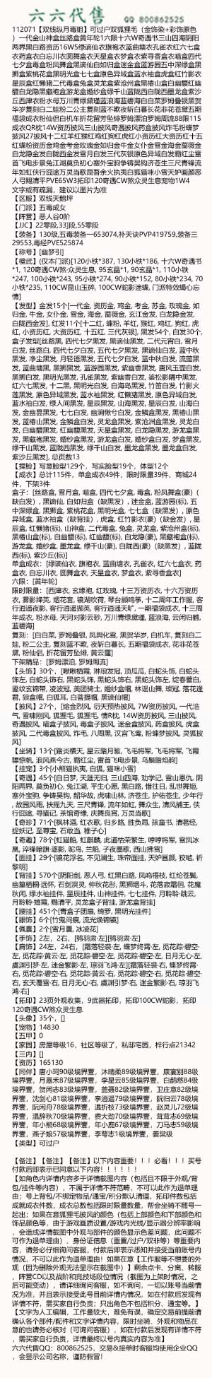 【如角色内详情内容多于详情截图内容(包括且不限于外观/背包/挂件等内容),不属于详情不符范畴,不可以此作为退单理由;号上背包/不绑定物品/通宝/积分默认清理,拓印件数包括成就成衣件数,成衣总数包括限时限量数量,帮会坐骑不随号一起出;如果在意狐狸毛披风的颜色(包括上部颜色和下部颜色和饰品颜色等,由于游戏画质设置/游戏内光线/显示器分辨率影响,会造成详情截图中外观与部件的颜色显示色差问题,此问题不可作为退单理由)、身份证信息(重置/过户/双非等)等重要内容,请务必仔细询问客服,付款后即表示悉知并接受当前账号内情况,不可以此作为退单理由!如果在意【工作服等不想要的外观(因为删除外观无法显示在截图中)】剩余点卡、分离、转服、阵营CD以及战阶和竞技场段位情况(截图为上架时情况,之后可能变动),请详细询问客服,如不询问,一切以账号当前情况为准,并且表示接受此号目前详情内情况,如在付款后发现有详情不符,需买家自行负责;只出角色不包括积分、通宝等。】