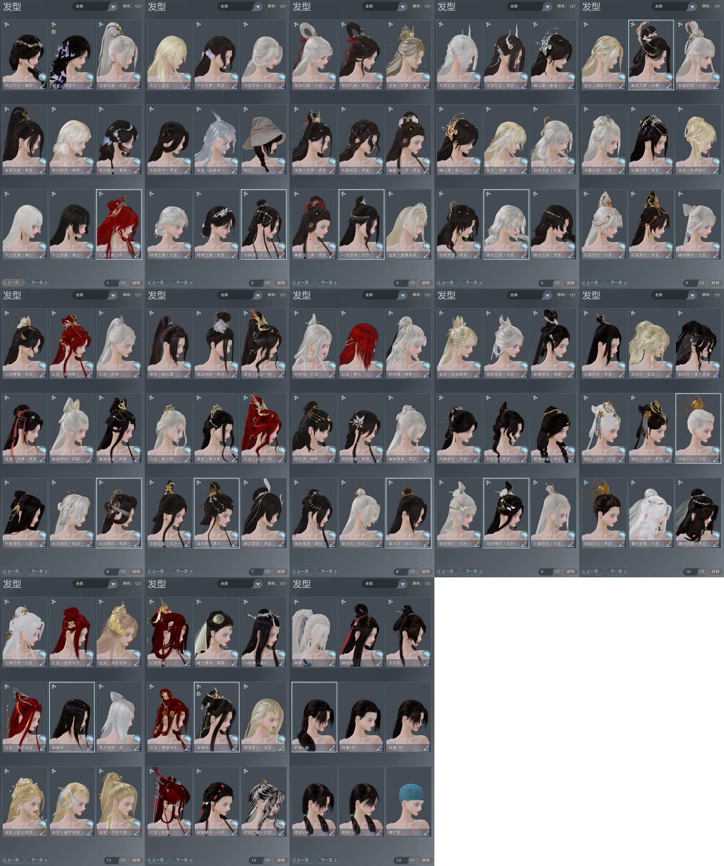 【发型】金发15个[一代金, 资历金, 鸡金, 考金, 苏金, 玫瑰金, 如归金, 牛金, 女仆金, 雪金, 海金, 蔷薇金, 玄江金发, 白龙隐金发, 白陇西金发], 红发11个[十二红, 蝶粉, 羊红, 猴红, 鸡红, 狗红, 虎红, 小资历红, 大资历红, 十五红, 三代灰银], 黑发54个, 白发30个, 盒子发型[丝路黑, 四代七夕黑发, 黑谪仙黑发, 二代元宵白, 雪月白发, 丝路白, 四代七夕白发, 五代七夕黑发, 黑谪仙白发, 蓝中秋黑发, 净尘黑发, 月轻语黑发, 五代七夕白发, 蓝中秋白发, 流萤黑发, 蓝曲塘黑, 黑狮黑发, 蓝游园黑发, 紫幽香黑发, 唐风玉壶白发, 黑狮白发, 黑明光黑发, 孔雀黑发, 紫幽香白发, 鉴松影隅中黑发, 红六七黑发, 十二黑, 黑明光白发, 白海岛黑发, 竹笛白发, 竹影火莲黑发, 原色异域黑发, 蓝水袖黑发, 红懒猪黑发, 原色异域白发, 蓝水袖白发, 绿人间黑发, 星辰黑发, 山海黑发, 星辰白发, 山海白发, 金幽昙黑发, 七七白发, 幽涧愀兮白发, 金鳞盒黑发, 黑椿山黑发, 蓝椿山黑发, 金鳞盒白发, 灵龙盒黑发, 紫沧洲盒黑发, 灵龙白发, 白幽馥黑发, 红幽馥黑发, 天星盒黑发, 白龙隐黑发, 游龙盒黑发, 黑藏袍黑发, 婚纱盒黑发, 游龙盒白发, 婚纱盒白发, 梦盒黑发, 绿千山黑发, 蓝陇西黑发, 绿千山白发, 墨龙盒黑发, 墨龙盒白发, 紫沙丘黑发], 总页数13