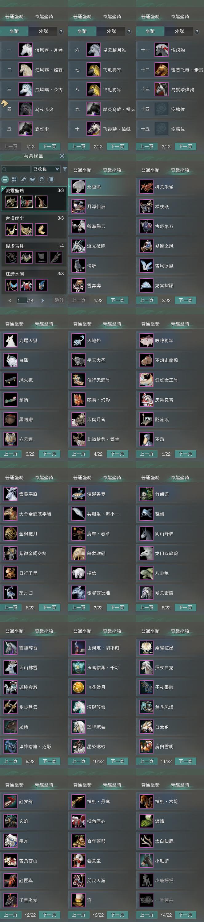 【坐骑】13个[踏炎横天, 星云踏月骓, 飞毛将军, 飞毛将军, 飞霞骠惊帆, 浪风燕今古, 霸红尘, 雷首飞电步景, 乌鬃踏焰驹]