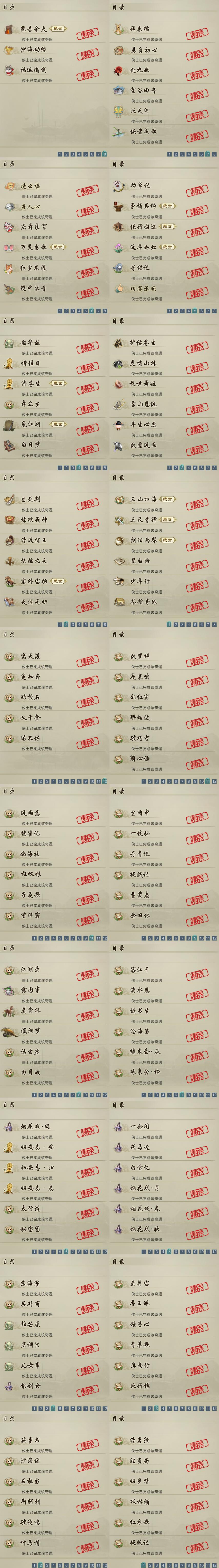 【奇遇】45个[白日梦, 天涯无归, 三山四海, 劝学记, 雪山恩仇, 阴阳两界, 莫负初心, 兔江湖, 平生心愿, 黑白路, 惜往日, 乱世舞姬, 塞外宝驹, 争铸吴钩, 韶华故, 虎啸山林, 济苍生, 护佑苍生, 少年行, 故园风雨, 扶摇九天, 三尺青锋, 流年如虹, 舞众生, 清风捕王, 侠行囧途, 寻猫记, 茶馆奇缘, 庆舞良宵, 万灵当歌]