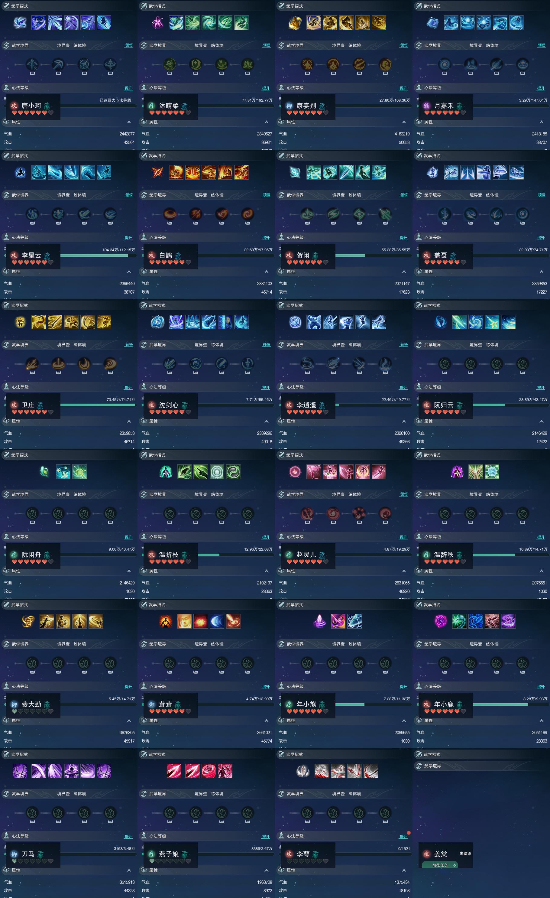 【同伴】唐小珂90级境界壹,沐晴柔89级境界壹,康宴别88级境界壹,月嘉禾87级境界壹,李星云85级境界壹,白鹊慈84级境界壹,贺闲志83级境界壹,盖聂82级境界壹,卫庄意82级境界壹,沈剑心81级境界壹,李逍遥79级境界壹,阮归云78级境界壹,阮闲舟78级境界壹,温折枝73级境界壹,赵灵儿72级境界壹,温辞秋70级境界壹,费大劲70级境界壹,茸茸志69级境界壹,年小熊68级境界壹,年小鹿67级境界壹,刀马志59级境界壹,燕子娘57级境界壹,李萼志1级境界壹,姜棠级