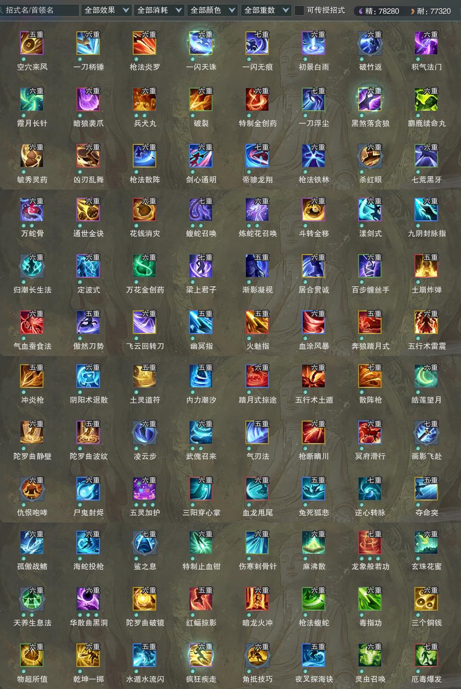 【橙武】(仅本门派)[120小铁*387, 130小铁*186, 十六W奇遇书*1, 120奇遇CW煞·众灵生息, 95玄晶*1, 90玄晶*1, 110小铁*247, 100小铁*243, 95小铁*274, 90小铁*152, 80小铁*234, 70小铁*235, 110CW昆山玉碎, 100CW蛇影迷蝶, 门派特效蝎心忘情]