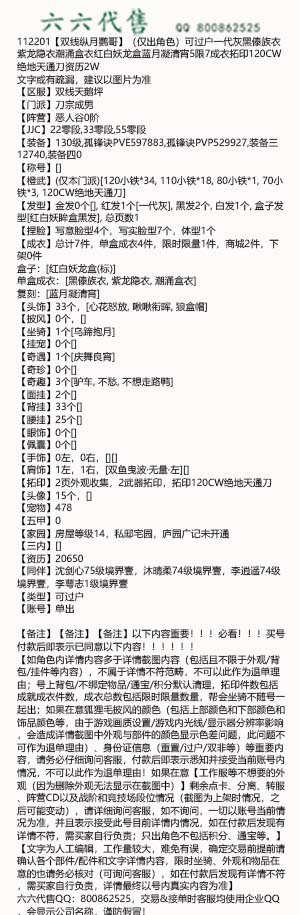 【如角色内详情内容多于详情截图内容(包括且不限于外观/背包/挂件等内容),不属于详情不符范畴,不可以此作为退单理由;号上背包/不绑定物品/通宝/积分默认清理,拓印件数包括成就成衣件数,成衣总数包括限时限量数量,帮会坐骑不随号一起出;如果在意狐狸毛披风的颜色(包括上部颜色和下部颜色和饰品颜色等,由于游戏画质设置/游戏内光线/显示器分辨率影响,会造成详情截图中外观与部件的颜色显示色差问题,此问题不可作为退单理由)、身份证信息(重置/过户/双非等)等重要内容,请务必仔细询问客服,付款后即表示悉知并接受当前账号内情况,不可以此作为退单理由!如果在意【工作服等不想要的外观(因为删除外观无法显示在截图中)】剩余点卡、分离、转服、阵营CD以及战阶和竞技场段位情况(截图为上架时情况,之后可能变动),请详细询问客服,如不询问,一切以账号当前情况为准,并且表示接受此号目前详情内情况,如在付款后发现有详情不符,需买家自行负责;只出角色不包括积分、通宝等。】