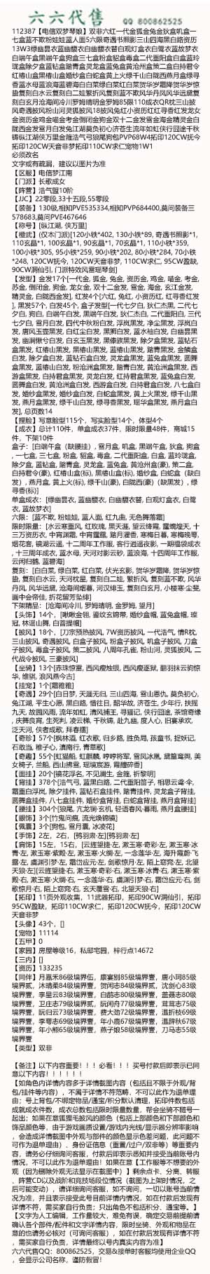 【如角色内详情内容多于详情截图内容(包括且不限于外观/背包/挂件等内容),不属于详情不符范畴,不可以此作为退单理由;号上背包/不绑定物品/通宝/积分默认清理,拓印件数包括成就成衣件数,成衣总数包括限时限量数量,帮会坐骑不随号一起出;如果在意狐狸毛披风的颜色(包括上部颜色和下部颜色和饰品颜色等,由于游戏画质设置/游戏内光线/显示器分辨率影响,会造成详情截图中外观与部件的颜色显示色差问题,此问题不可作为退单理由)、身份证信息(重置/过户/双非等)等重要内容,请务必仔细询问客服,付款后即表示悉知并接受当前账号内情况,不可以此作为退单理由!如果在意【工作服等不想要的外观(因为删除外观无法显示在截图中)】剩余点卡、分离、转服、阵营CD以及战阶和竞技场段位情况(截图为上架时情况,之后可能变动),请详细询问客服,如不询问,一切以账号当前情况为准,并且表示接受此号目前详情内情况,如在付款后发现有详情不符,需买家自行负责;只出角色不包括积分、通宝等。】