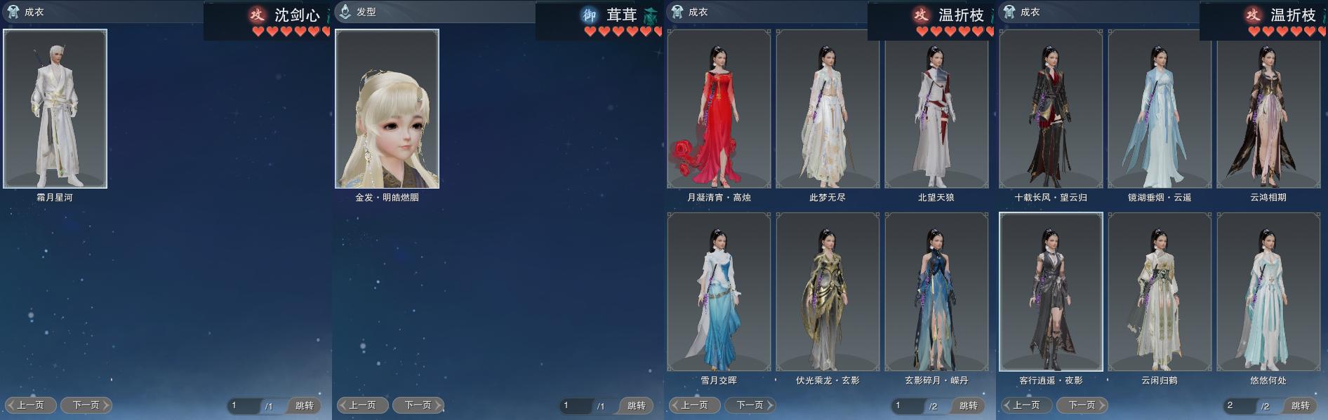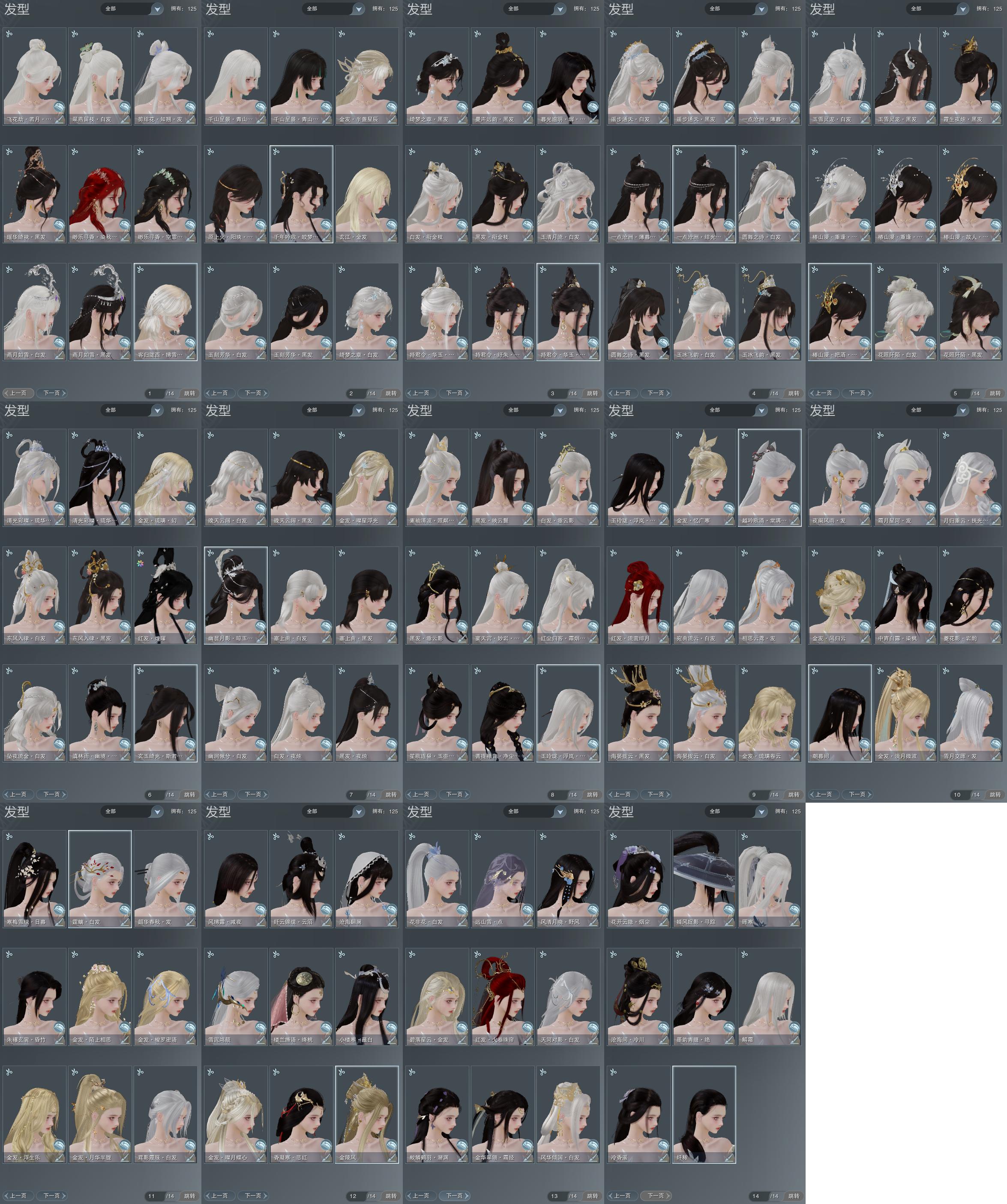 【发型】金发17个[一代金, 狐金, 兔金, 资历金, 鸡金, 喵金, 考金, 苏金, 倒闭金, 狗金, 龙女金, 双十二金发, 雪金, 海金, 玄江金发, 精灵金, 白陇西金发], 红发4个[六红, 兔红, 小资历红, 红寻香红发], 黑发57个, 白发45个, 盒子发型[一代七夕白, 狄仁杰黑, 二代七夕白, 狗白, 白端午白发, 黑端午白发, 狄仁杰白, 二代重阳白, 三代七夕白, 雪月白发, 四代中秋粉白发, 浮岚黑发, 净尘黑发, 浮岚白发, 唐风玉壶黑发, 白红尘白发, 黑狮白发, 蓝水袖白发, 白幽昙黑发, 幽涧愀兮白发, 白玄玉黑发, 黑傣族黑发, 除夕盒黑发, 蓝钻石盒黑发, 红椿山黑发, 黑椿山黑发, 蓝椿山黑发, 踏青黑发, 金鳞盒白发, 除夕盒白发, 蓝钻石盒白发, 灵龙盒黑发, 蓝兔盒黑发, 圆舞盒黑发, 蓝椿山白发, 粉沧洲盒黑发, 踏青白发, 黄沧洲盒黑发, 西游盒黑发, 白持君盒黑发, 灵龙白发, 红持君盒黑发, 蓝兔盒白发, 圆舞盒白发, 黄沧洲盒白发, 西游盒白发, 白持君盒白发, 八七盒白发, 婚纱盒黑发, 婚纱盒白发, 白蛇盒黑发, 黄上火黑发, 绿千山黑发, 燕月盒黑发, 绿千山白发, 绿寻香黑发, 瑶华盒黑发, 燕月盒白发], 总页数14