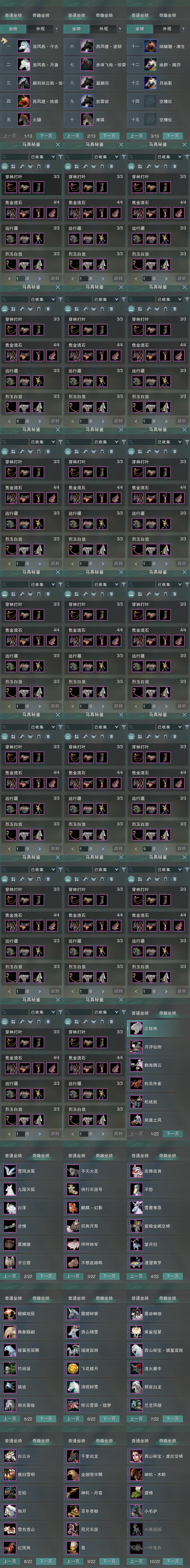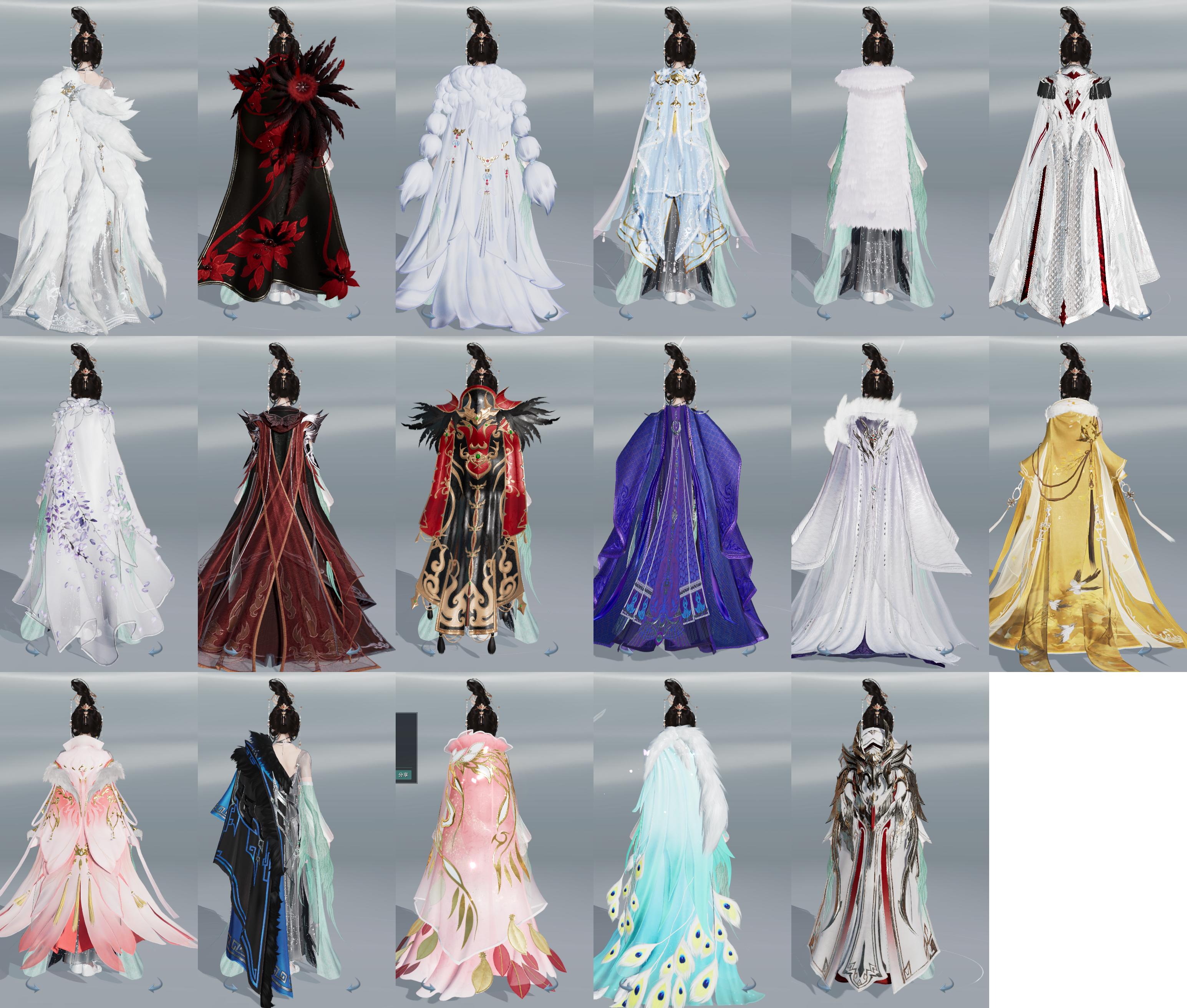 限时限量:[水云寒重风, 红玫瑰, 黑天涯, 望云绛霞, 霆螭煌天, 十三万资历衣, 中宵渊霜, 中宵霆露, 踏月濯香, 寒梅日暮, 寒梅晚萼, 烟花套, 镜湖云遥, 十二周年工作服, 客行逍遥夜影, 一期福袋成衣, 十三周年成衣, 蓝水母, 天河对影云砂, 蓝浪海, 十四周年工作服, 云闲归鹤, 蓝碧海]