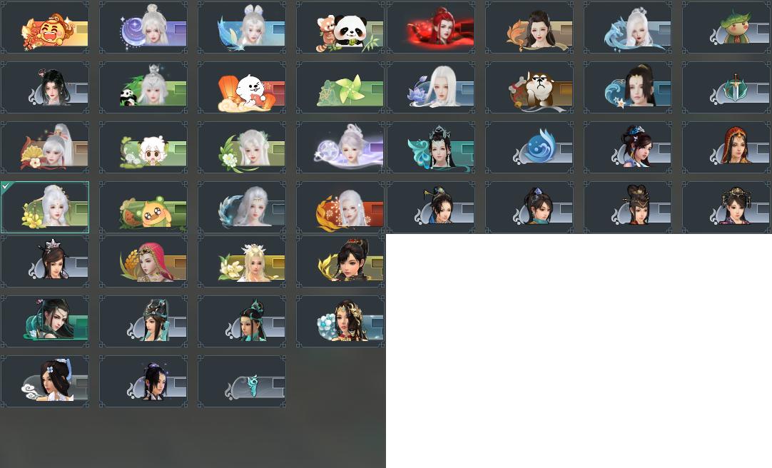 盒子:[白端午盒(缺腰挂), 雪月盒, 叽盒, 黑端午盒, 狄盒, 狗盒, 一七盒, 三七盒, 粉盒, 貂盒, 毒盒, 二代重阳盒, 白盒, 蓝玲珑盒, 除夕盒, 蓝钻盒, 踏青盒, 灵龙盒, 蓝兔盒, 黄沧州盒(豪), 策二盒, 白持君令(豪), 红椿山盒(标), 黑椿山盒(标), 婚纱盒, 白蛇盒(缺白发), 燕月盒, 黄上火(标), 绿千山(豪), 白陇西(豪)(缺黑发), 绿寻香(标)]