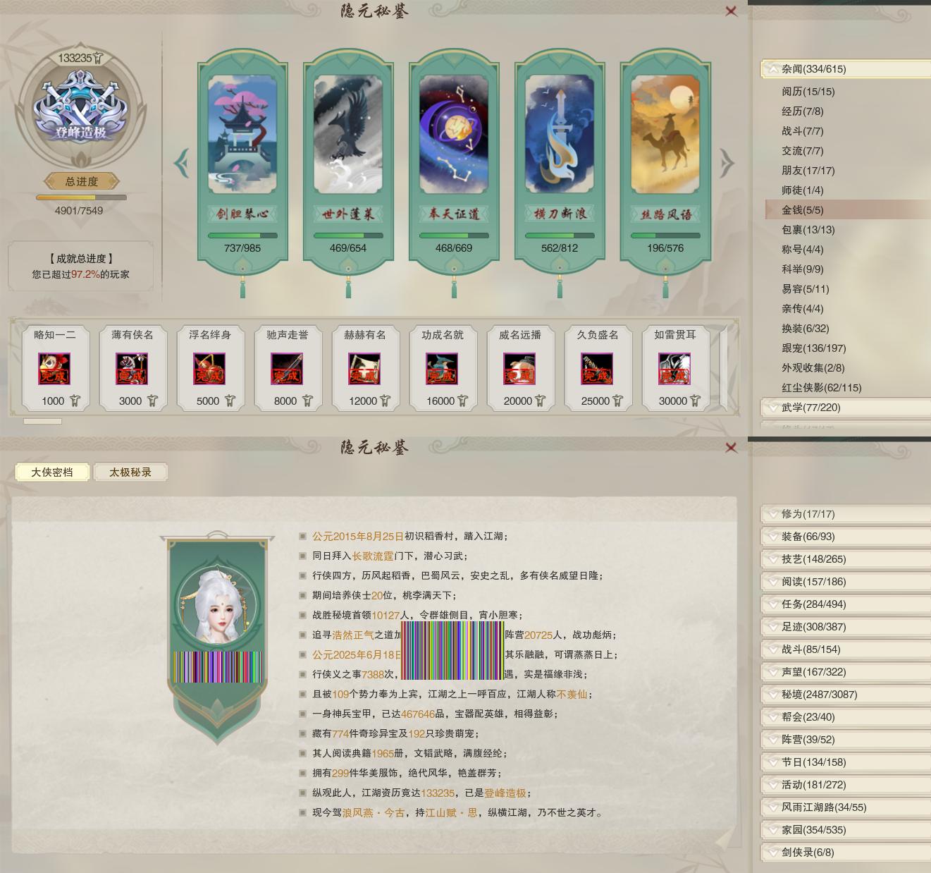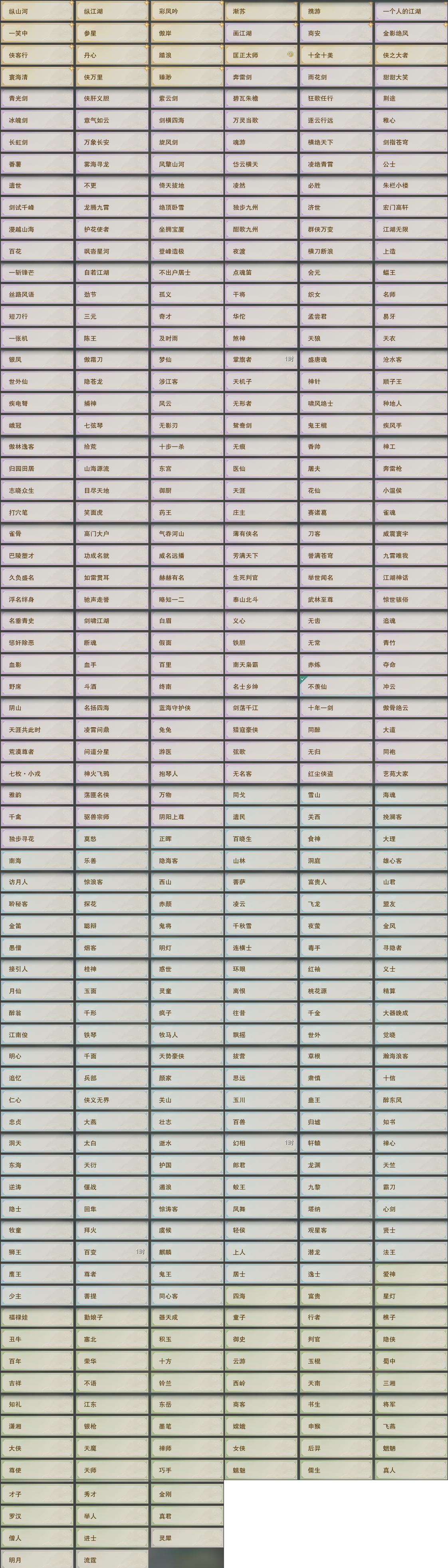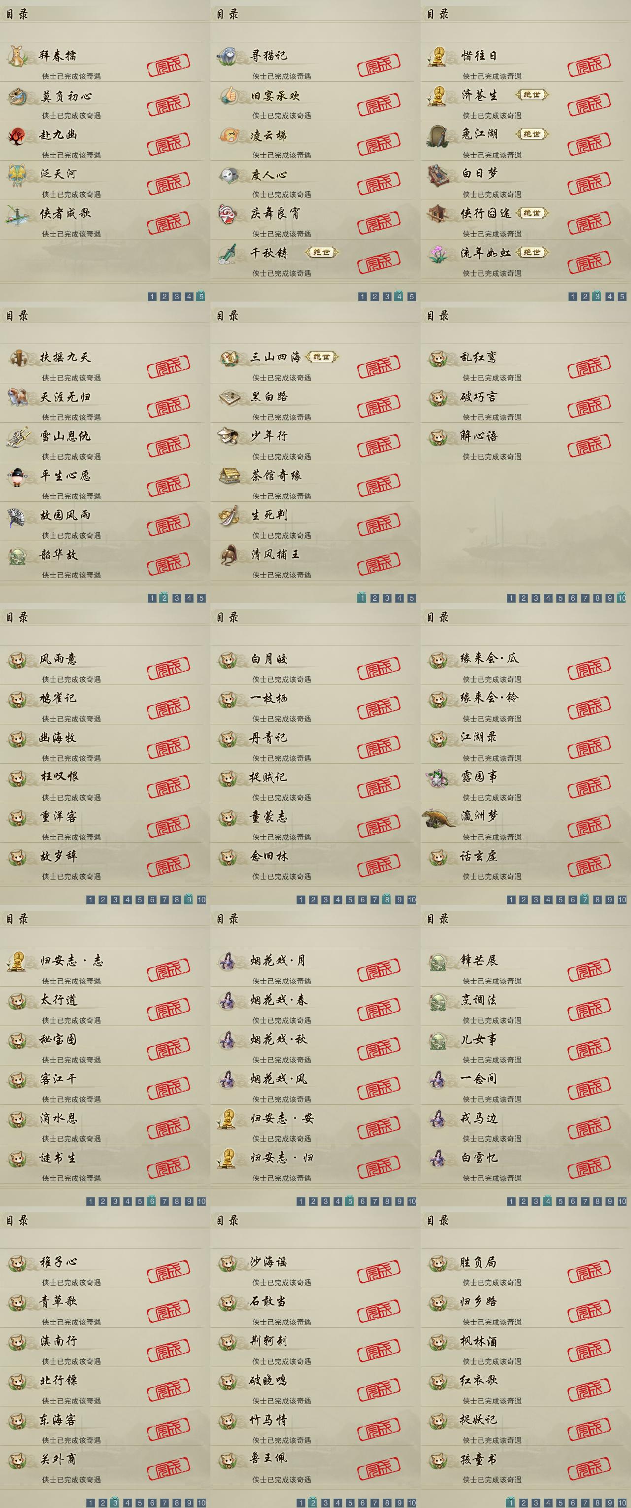 【奇遇】29个[白日梦, 天涯无归, 三山四海, 雪山恩仇, 莫负初心, 兔江湖, 平生心愿, 黑白路, 惜往日, 韶华故, 济苍生, 少年行, 扶摇九天, 故园风雨, 流年如虹, 清风捕王, 寻猫记, 侠行囧途, 茶馆奇缘, 庆舞良宵, 生死判, 凌云梯, 千秋铸, 赴九幽, 度人心, 旧宴承欢, 泛天河, 侠者成歌, 拜春擂]