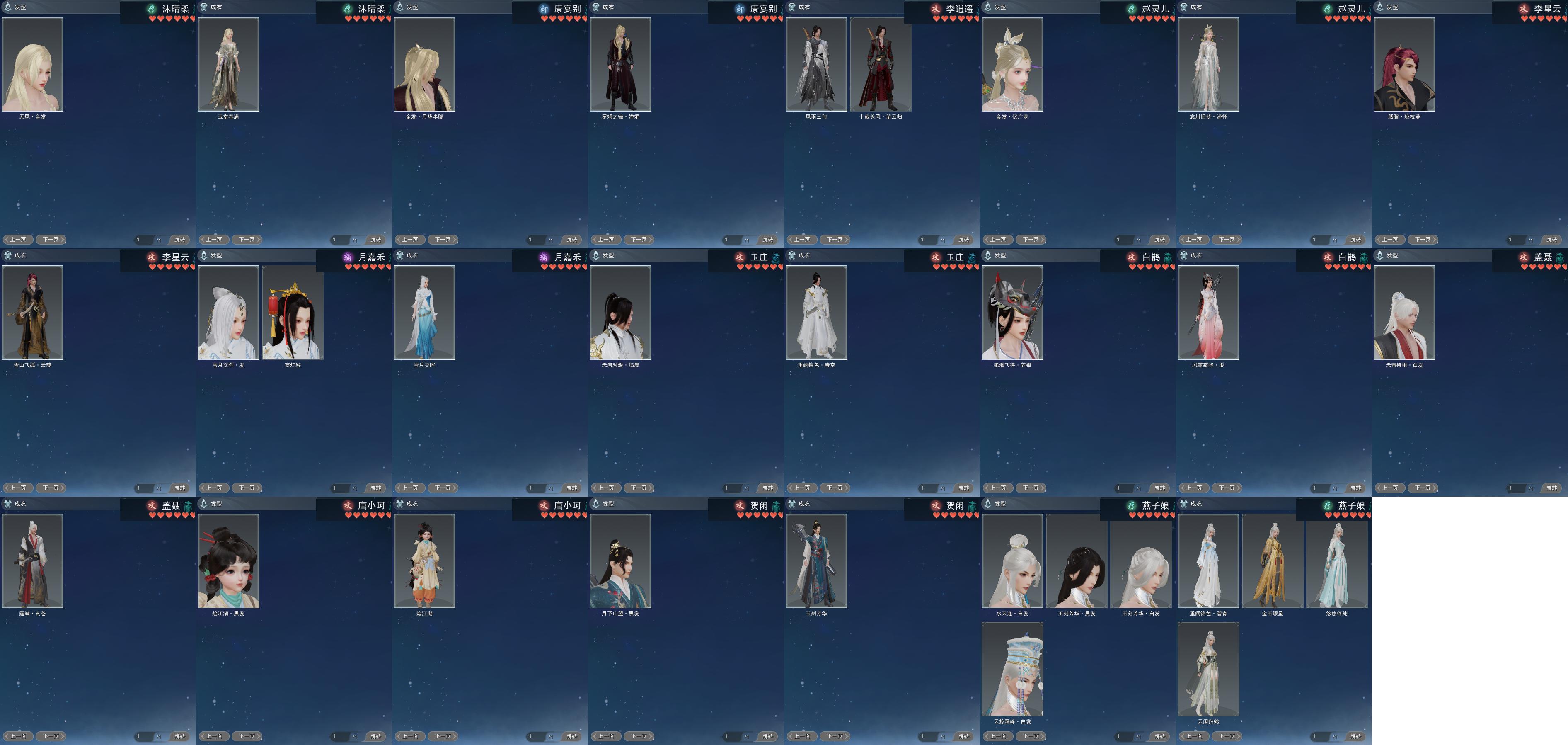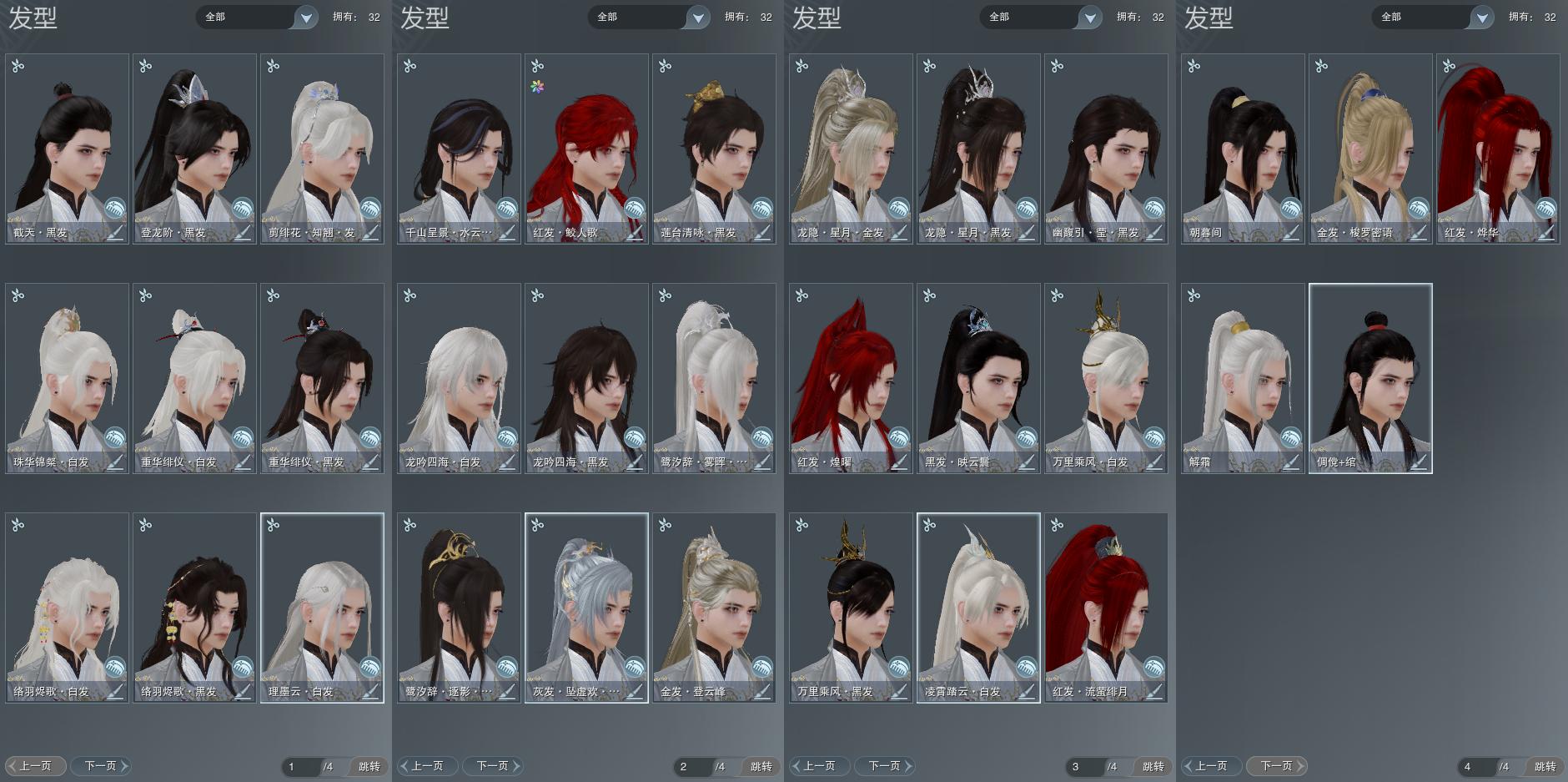 【发型】金发6个[兔金, 资历金, 鸡金, 三代金, 无风金发, 紫龙隐金发], 红发6个[七红, 紫发, 兔红, 小资历红, 十五红, 三代灰金], 黑发19个, 白发15个, 盒子发型[乘风黑发, 雪月白发, 踏云白发, 乘风白发, 白幽馥黑发, 紫龙隐黑发, 黑鹭黑发, 龙吟盒黑发, 莲台盒黑发, 白鹭白发, 九七黑发, 龙吟盒白发, 白千山黑发, 云掠霜峰白发, 络羽黑发, 络羽白发, 瓷盒白发], 总页数4