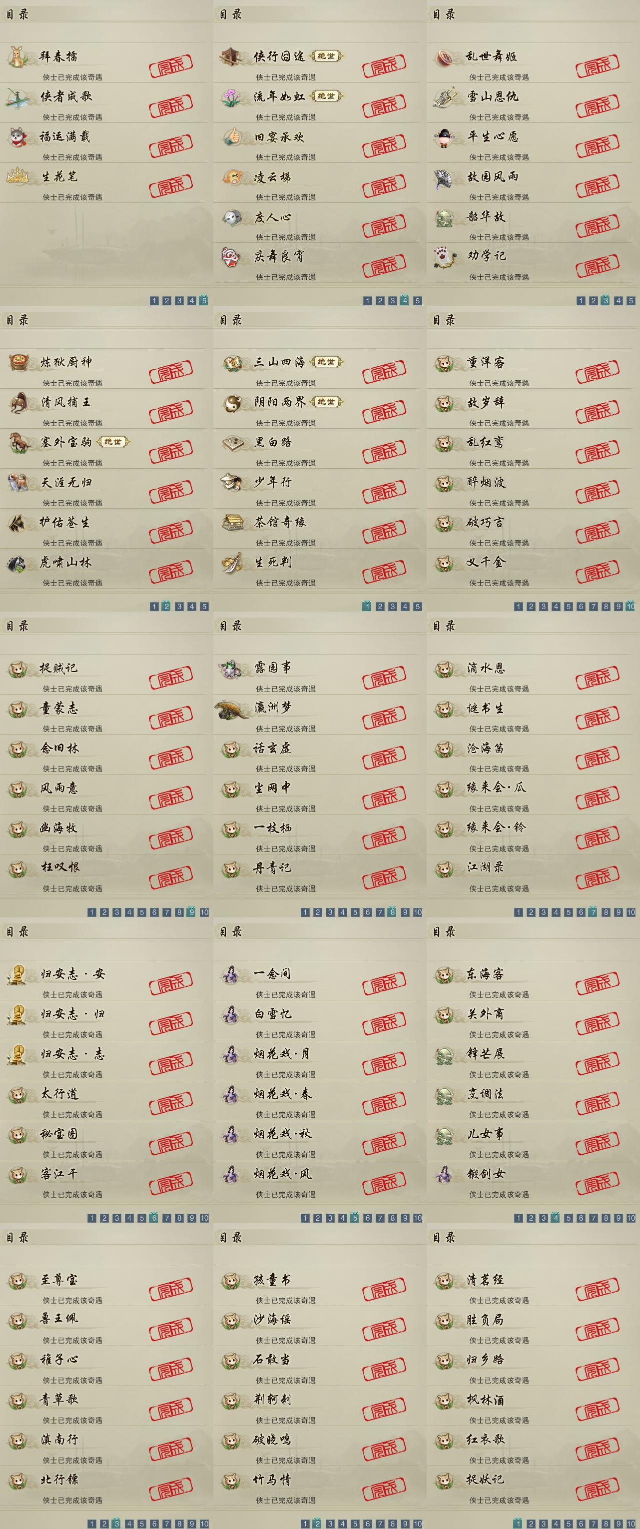 【奇遇】28个[天涯无归, 三山四海, 雪山恩仇, 劝学记, 阴阳两界, 平生心愿, 黑白路, 乱世舞姬, 塞外宝驹, 韶华故, 虎啸山林, 护佑苍生, 少年行, 故园风雨, 流年如虹, 清风捕王, 侠行囧途, 茶馆奇缘, 庆舞良宵, 生死判, 凌云梯, 炼狱厨神, 度人心, 旧宴承欢, 侠者成歌, 拜春擂, 福运满载, 生花笔]