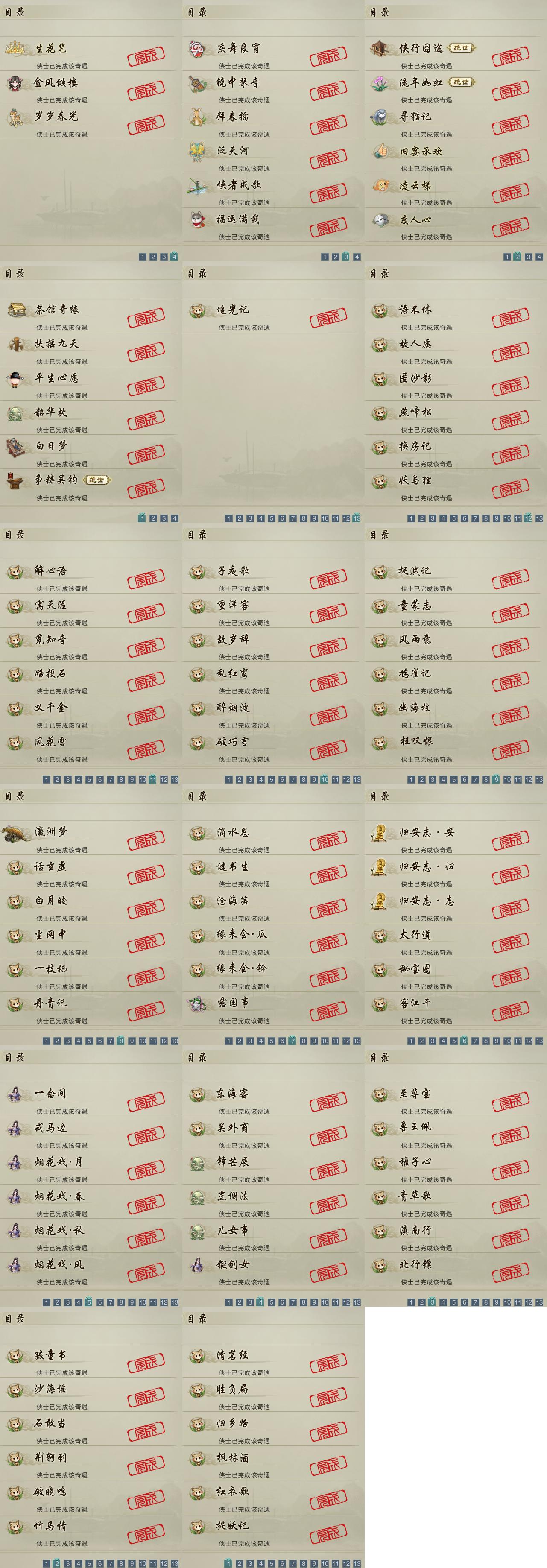 【奇遇】20个[白日梦, 平生心愿, 韶华故, 争铸吴钩, 扶摇九天, 流年如虹, 侠行囧途, 寻猫记, 茶馆奇缘, 庆舞良宵, 凌云梯, 度人心, 旧宴承欢, 镜中琴音, 泛天河, 侠者成歌, 拜春擂, 福运满载, 生花笔, 金风倾楼]