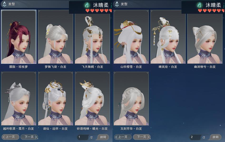 【发型】金发12个[狐金, 资历金, 鸡金, 苏金, 如归金, 凤金, 云金, 雪金, 玄江金发, 七中金发, 金发奉清茗, 澄琼枝金发], 红发8个[五红, 八红, 紫发, 蝶粉, 猴红, 小资历红, 红寻香红发, 一代灰], 黑发41个, 白发20个, 盒子发型[丝路黑, 飞天黑发, 四代中秋蓝黑发, 黑谪仙黑发, 晴岚绘黑发, 山吹樱雪黑发, 白楼兰黑发, 丝路白, 飞天白发, 四代中秋蓝白发, 黑谪仙白发, 晴岚绘白发, 山吹樱雪白发, 白楼兰白发, 浮岚黑发, 沧海黑发, 小熊黑发, 小熊白发, 紫人间黑发, 山海黑发, 七七黑发, 山海白发, 七七白发, 幽涧愀兮白发, 镖盒白发, 紫观灯盒黑发, 镰刀黑发, 燕月盒黑发, 绿寻香黑发, 仙剑黑发, 潮涌盒黑发, 络羽黑发, 仙剑白发, 络羽白发, 十七黑发, 黑战国黑发, 紫浮光黑发, 白天山黑发, 粉毛衣黑发], 总页数9