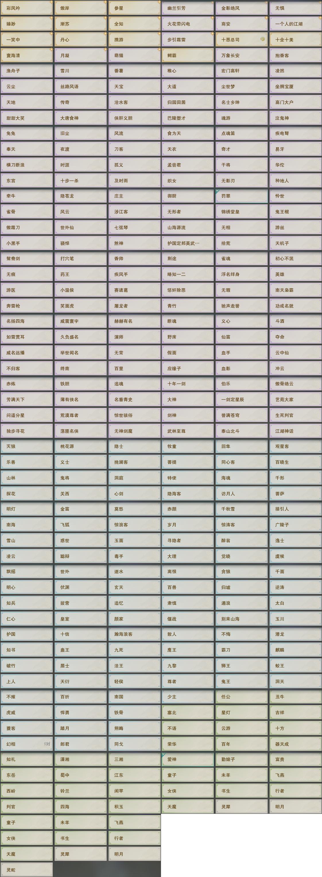 【奇遇】26个[白日梦, 天涯无归, 雪山恩仇, 平生心愿, 兔江湖, 惜往日, 少年行, 护佑苍生, 故园风雨, 扶摇九天, 流年如虹, 舞众生, 侠行囧途, 寻猫记, 茶馆奇缘, 庆舞良宵, 入蛟宫, 生死判, 凌云梯, 度人心, 旧宴承欢, 镜中琴音, 泛天河, 拜春擂, 福运满载, 生花笔]