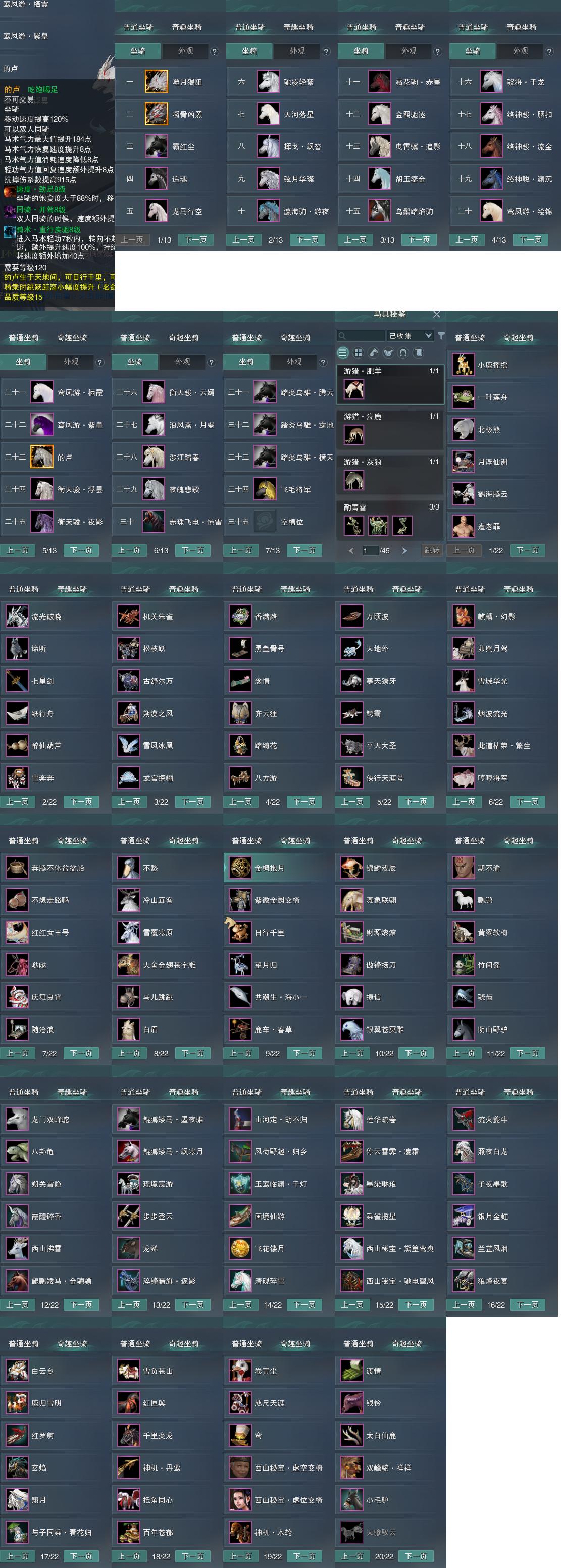 【坐骑】34个[的卢, 踏炎横天, 踏炎腾云, 踏炎霸地, 赤珠惊雷, 飞毛将军, 阵营白狼, 恶人熊, 小樱马, 雪马, 跃荷马, 金羁驰逐, 白龙马, 弦月马, 黑翅马, 霜花驹赤星, 络神骏胭扣, 络神骏流金, 络神骏渊沉, 挥戈飒沓]