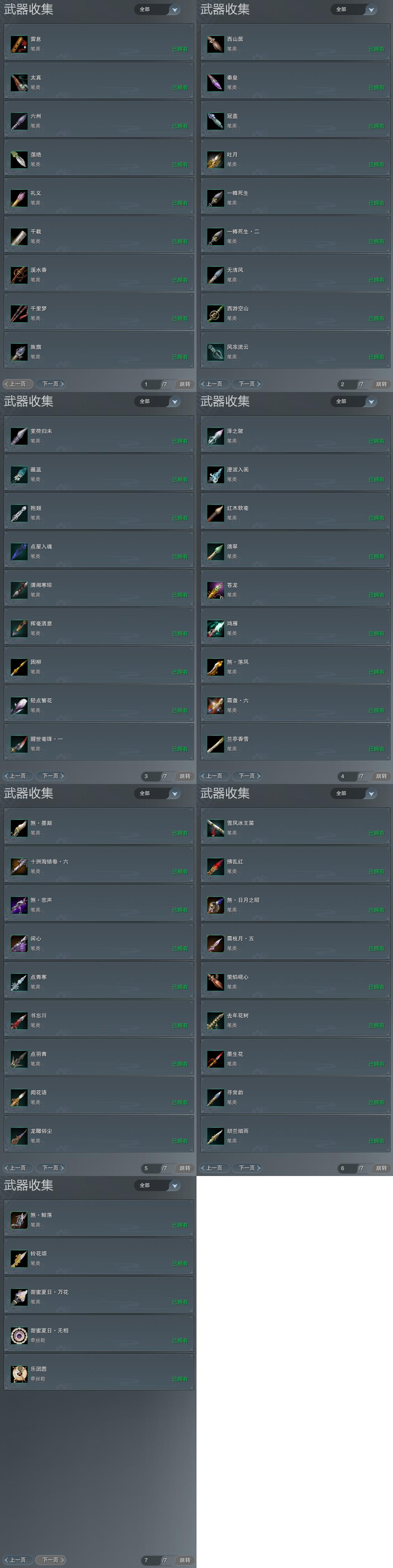 【拓印】24页外观收集,59武器拓印,拓印70CW苍龙,拓印80CW鸿雁,拓印90奇遇CW煞·落凤,拓印95小CW霜盏,拓印95CW兰亭,拓印95奇遇CW煞·墨颠,拓印100小CW十洲海错卷,拓印100奇遇CW煞·悲声,拓印110CW闲心,拓印门派特效雪凤冰王笛,拓印110奇遇CW煞日月之昭,拓印120奇遇CW煞鲸落