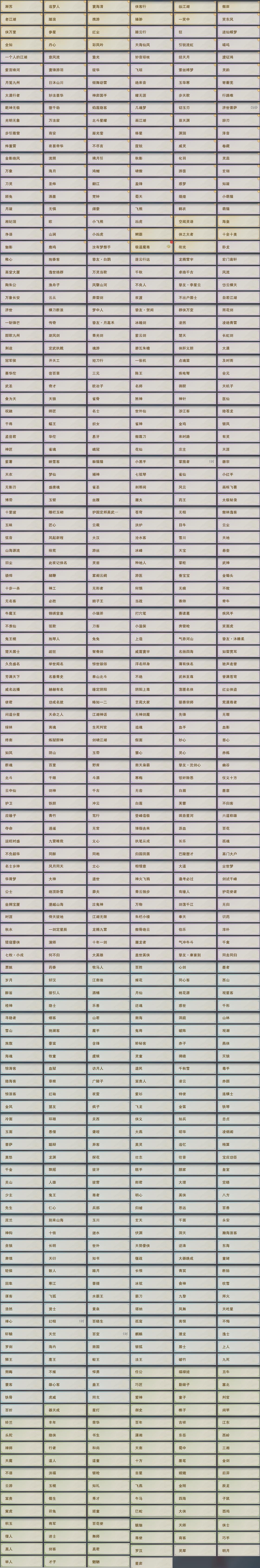 【奇遇】53个[白日梦, 天涯无归, 三山四海, 劝学记, 雪山恩仇, 阴阳两界, 莫负初心, 兔江湖, 平生心愿, 黑白路, 惜往日, 乱世舞姬, 塞外宝驹, 争铸吴钩, 韶华故, 虎啸山林, 济苍生, 护佑苍生, 少年行, 故园风雨, 扶摇九天, 三尺青锋, 流年如虹, 舞众生, 清风捕王, 侠行囧途, 寻猫记, 茶馆奇缘, 入蛟宫, 庆舞良宵]