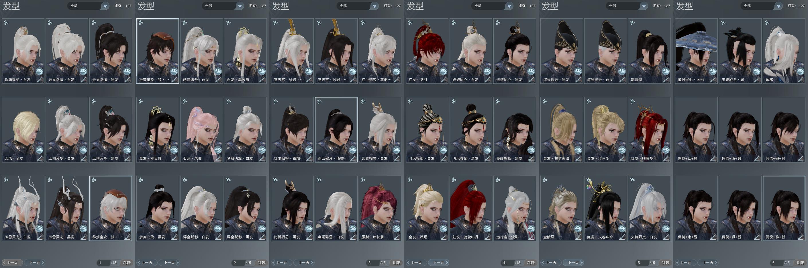 【发型】金发5个[一代金, 资历金, 喵金, 猪金, 无风金发], 红发6个[六红, 十红, 紫发, 凤仙粉, 猴红, 小资历红], 黑发19个, 白发18个, 盒子发型[丝路黑, 狄仁杰黑, 飞天黑发, 四代七夕黑发, 狄仁杰白, 飞天白发, 四代七夕白发, 五代七夕黑发, 粉同人黑发, 幽阑白发, 五代七夕白发, 白红尘黑发, 黑狮黑发, 小金龙黑发, 白红尘白发, 黑狮白发, 小熊黑发, 小金龙白发, 小熊白发, 狼盒黑发, 狼盒白发, 幽涧愀兮白发, 灵龙盒黑发, 灵龙白发, 仙剑黑发, 仙剑白发], 总页数7