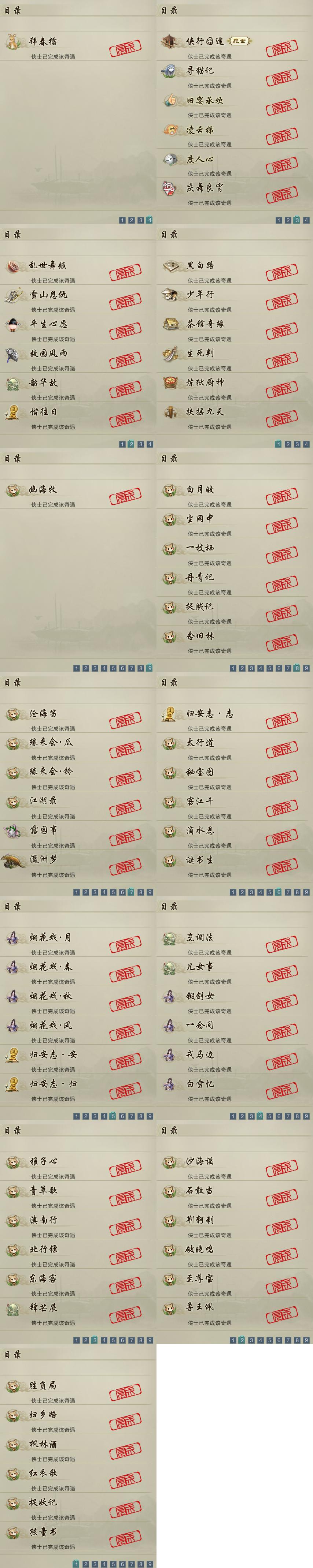 【奇遇】19个[雪山恩仇, 平生心愿, 黑白路, 乱世舞姬, 惜往日, 韶华故, 少年行, 故园风雨, 扶摇九天, 侠行囧途, 寻猫记, 茶馆奇缘, 庆舞良宵, 生死判, 凌云梯, 炼狱厨神, 度人心, 旧宴承欢, 拜春擂]