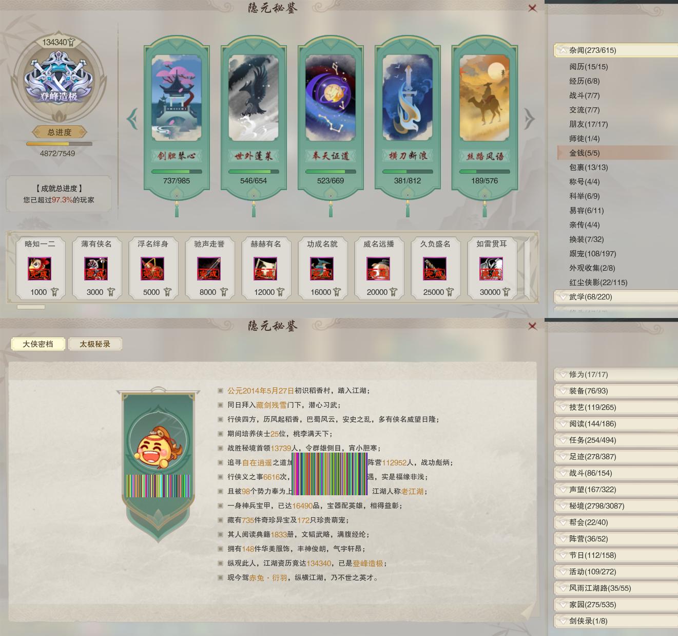 【同伴】沈剑心87级境界壹,沐晴柔85级境界壹,阮归云84级境界壹,年小熊75级境界壹,温辞秋74级境界壹,茸茸志61级境界壹,温折枝25级境界壹,阮闲舟13级境界壹,年小鹿1级境界壹,燕子娘1级境界壹,盖聂志1级境界壹,李逍遥1级境界壹,李萼志1级境界壹