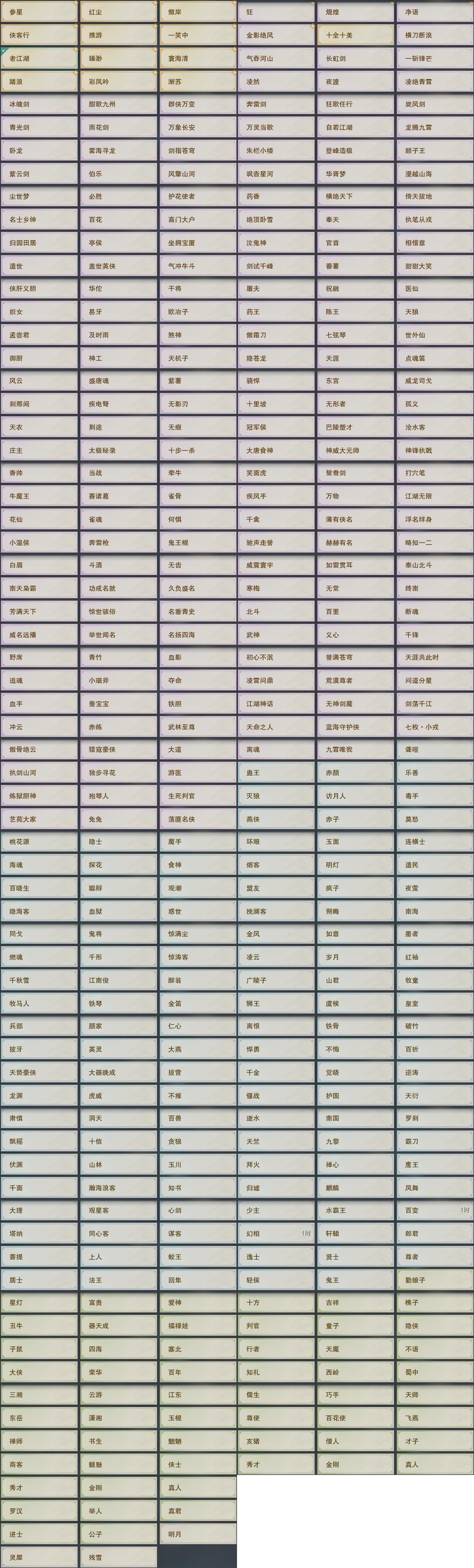 【肩饰】17左,9右,[双鱼曳波·无量·左, 绝代仙·墨楼·左, 一念莲华·左, 广漠听星·左, 云中雪霁·左, 剑歌惊月·左][绝代仙·墨楼·右, 一念莲华·右, 广漠听星·右, 云中雪霁·右, 剑歌惊月·右]