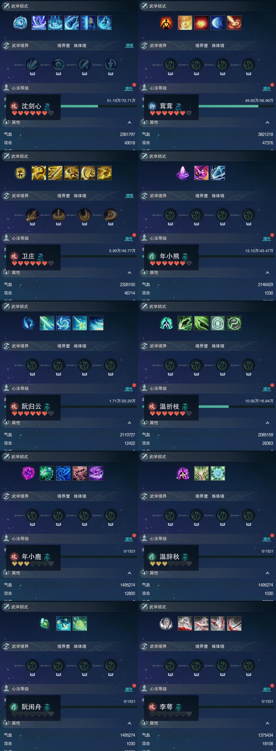 【同伴】沈剑心83级境界壹,茸茸80级境界壹,卫庄意79级境界壹,年小熊78级境界壹,阮归云74级境界壹,温折枝71级境界壹,年小鹿1级境界壹,温辞秋1级境界壹,阮闲舟1级境界壹,李萼志1级境界壹