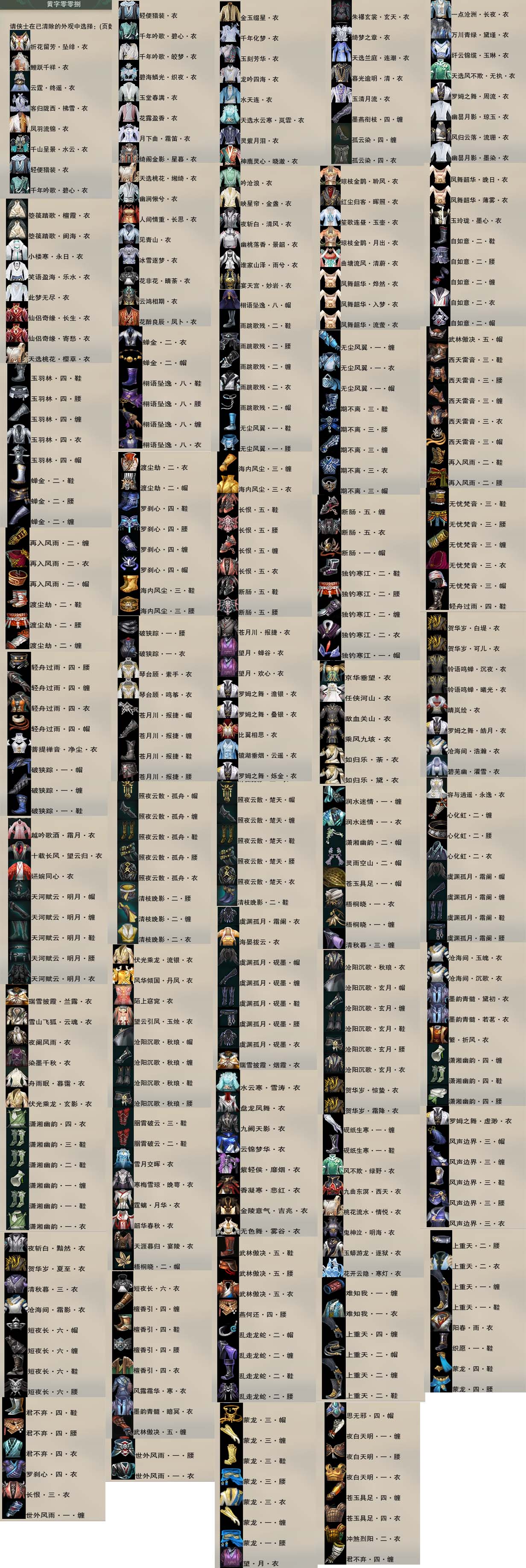 单盒成衣:[蓝玲珑衣, 白游园衣, 金海岛衣, 黑懒猪衣, 虎盒衣, 蝴蝶盒衣, 山神盒衣, 二代毒盒衣, 蓝兔盒衣, 粉沧洲盒衣, 青山盒衣, 海阔盒衣, 白鹭衣, 蓝鹭衣, 咩盒衣, 九七盒衣, 彩陇西成衣, 粉陇西成衣, 瑶华盒成衣, 瓷盒衣, 云间盒衣]