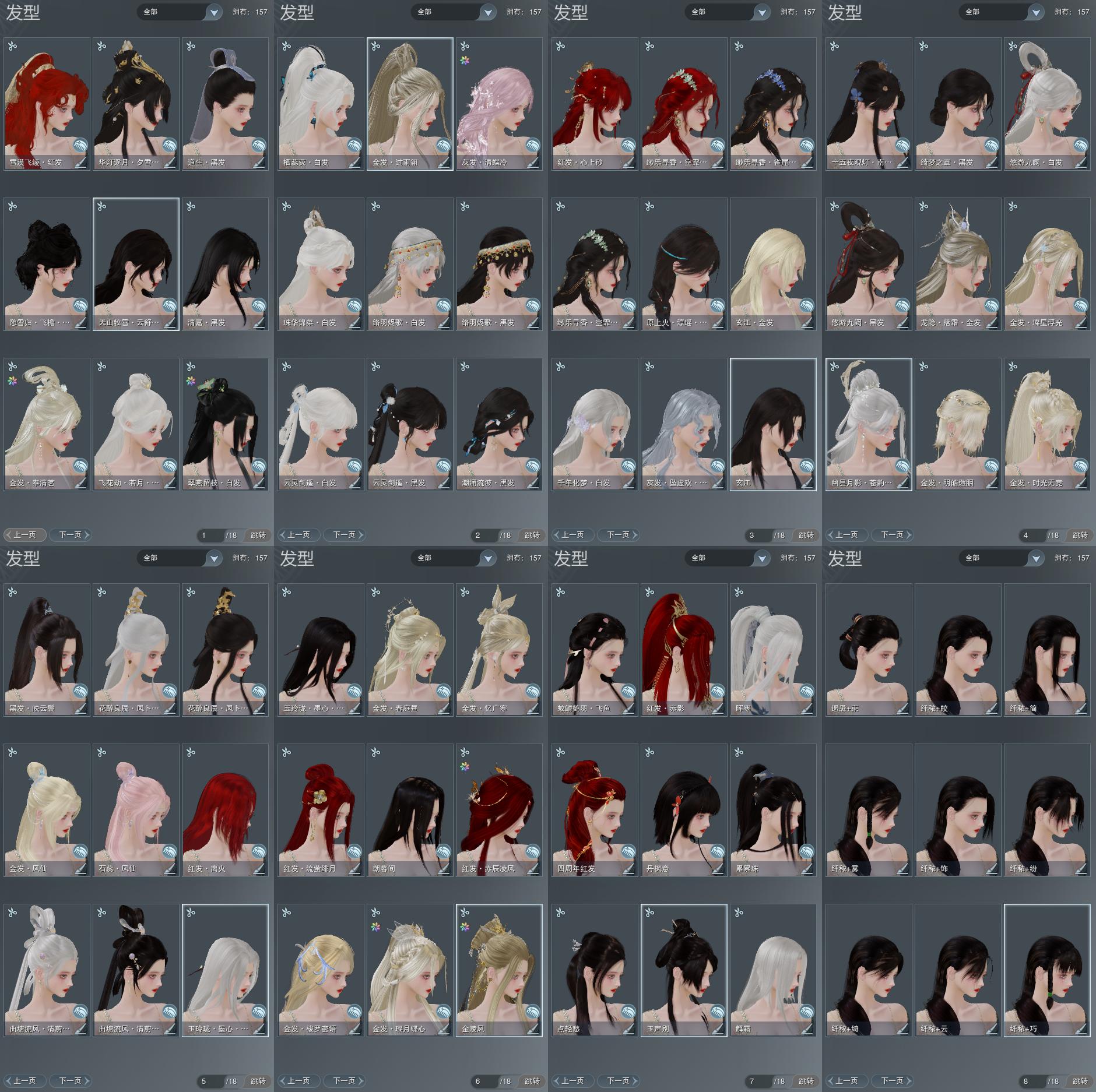 【发型】金发29个[一代金, 狐金, 兔金, 资历金, 鼠金, 猪金, 珊瑚金, 角金, 凤金, 时光金, 牛金, 巴卡金, 云金, 凤仙金, 双十二金发, 女仆金, 雪金, 海金, 龙金, 铃金, 玄江金发, 精灵金, 翎金, 金发奉清茗, 澄琼枝金发, 蓝游园金发, 紫雨山前金发, 蓝龙隐金发, 白陇西金发], 红发14个[四红, 五红, 八红, 九红, 凤仙粉, 蝶粉, 猴红, 小资历红, 大资历红, 十五红, 蛇红, 绿寻香红发, 雪漠飞绫红发, 三代灰银], 黑发74个, 白发48个, 盒子发型[丝路黑, 狄仁杰黑, 二代七夕白, 一代花朝白白, 踏云黑发, 四代七夕黑发, 四代中秋蓝黑发, 黑端午白发, 狄仁杰白, 雪月白发, 晴岚绘黑发, 白楼兰黑发, 黑楼兰黑发, 丝路白, 白如归黑发, 踏云白发, 四代七夕白发, 四代中秋蓝白发, 幽阑黑发, 二代乘风黑发, 五代七夕黑发, 晴岚绘白发, 白楼兰白发, 墨心黑发, 黑楼兰白发, 净尘黑发, 幽阑白发, 二代乘风白发, 五代七夕白发, 薄雾黑发, 蓝曲塘黑, 澄琼枝黑发, 墨心白发, 沧海黑发, 唐风玉壶黑发, 黑红尘黑发, 黑狮黑发, 蓝游园黑发, 蓝曲塘白, 蓝幽香黑发, 沧海白发, 唐风玉壶白发, 小金龙黑发, 黑红尘白发, 黑狮白发, 竹笛黑发, 小金龙白发, 红六七黑发, 竹笛白发, 红六七白发, 红梅盒黑发, 花滑黑发, 红梅盒白发, 花滑白发, 幽涧愀兮白发, 绿幽昙白发, 蓝椿山白发, 蓝沧洲盒黑发, 白幽馥黑发, 天星盒黑发, 游龙盒黑发, 婚纱盒黑发, 天星盒白发, 粉鹿黑发, 蓝观灯盒黑发, 游龙盒白发, 茄盒黑发, 婚纱盒白发, 粉鹿白发, 茄盒白发, 九七黑发, 青蛇盒黑发, 白蛇盒黑发, 梦盒白发, 蓝上火黑发, 瑞雪盒黑发, 蓝寻香黑发, 绿寻香黑发, 瑶华盒黑发, 绿故梦黑发, 仙剑黑发, 潮涌盒黑发, 络羽黑发, 仙剑白发, 络羽白发, 紫天山黑发, 蓝毛衣黑发, 华灯夕雪黑发], 总页数9