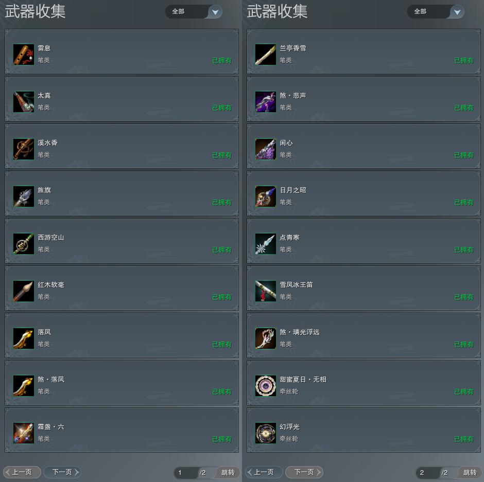 【拓印】4页外观收集,18武器拓印,拓印90CW落凤,拓印90奇遇CW煞·落凤,拓印95小CW霜盏,拓印95CW兰亭,拓印100奇遇CW煞·悲声,拓印110CW闲心,拓印110CW日月之昭,拓印门派特效雪凤冰王笛,拓印120奇遇CW煞璃光浮远