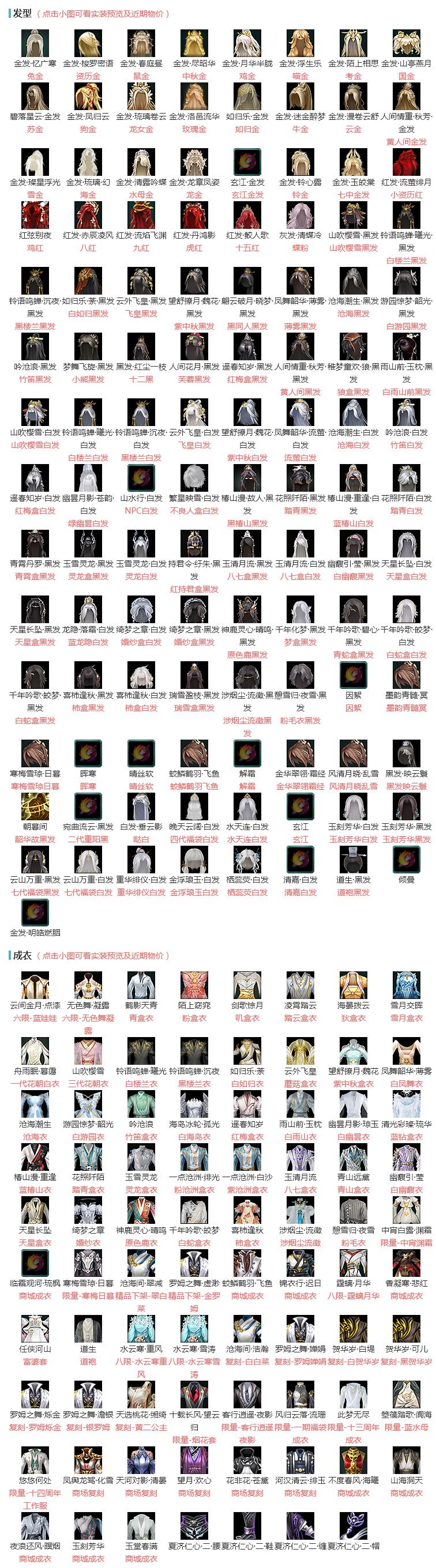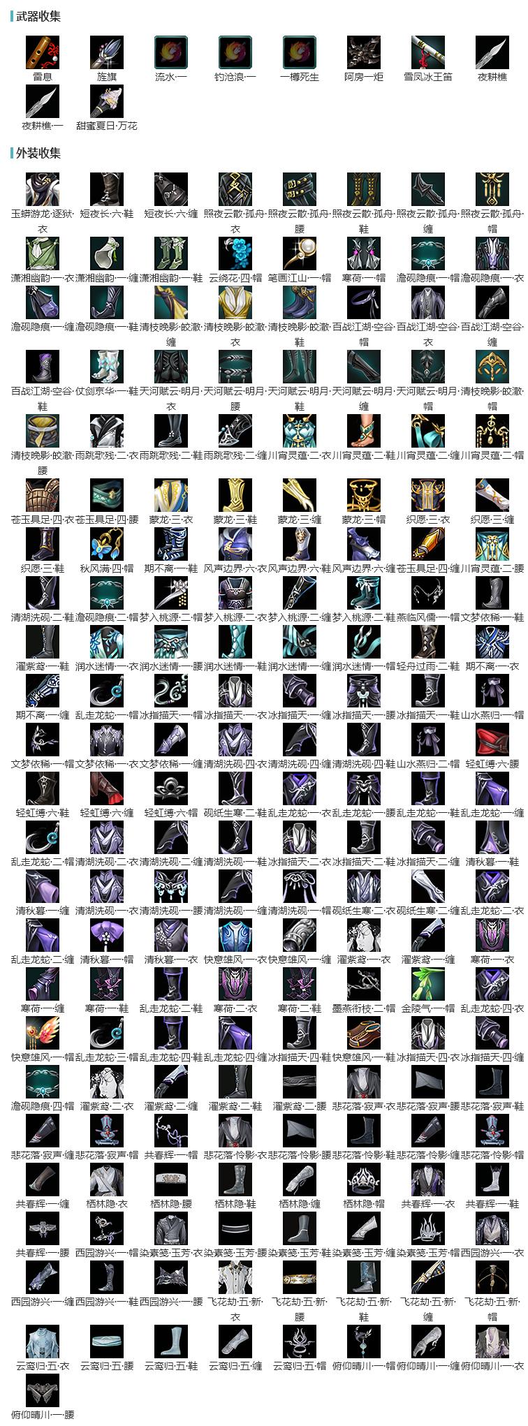 限时限量:[水云寒重风, 水云寒雪涛, 蓝水母, 烟花套, 寒梅日暮, 一期福袋成衣, 道袍, 霆螭月华, 十三周年成衣, 十四周年工作服, 客行逍遥夜影, 富婆套, 中宵渊霜]