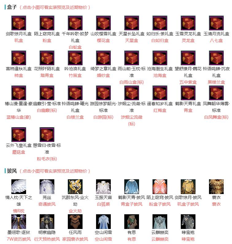 盒子:[叽盒, 蘑菇盒, 白凤舞盒(标), 粉盒, 青盒, 白如归盒, 樱花盒, 沧海盒, 白楼兰盒, 黑楼兰盒, 五中紫盒, 白游园(标), 竹笛盒, 柿盒, 红梅盒, 白雨山盒(标), 踏青盒, 灵龙盒, 八七盒, 白幽馥(标), 蓝椿山盒(豪)(缺发型), 天星盒, 婚纱盒, 白蛇盒, 涉烟尘流徵(标), 粉毛衣(标)]