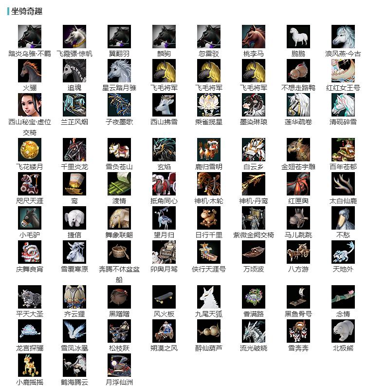 【坐骑】6个[踏炎不羁, 星云踏月骓, 飞霞骠惊帆, 飞毛将军, 鹏鹏, 浪风燕今古]
