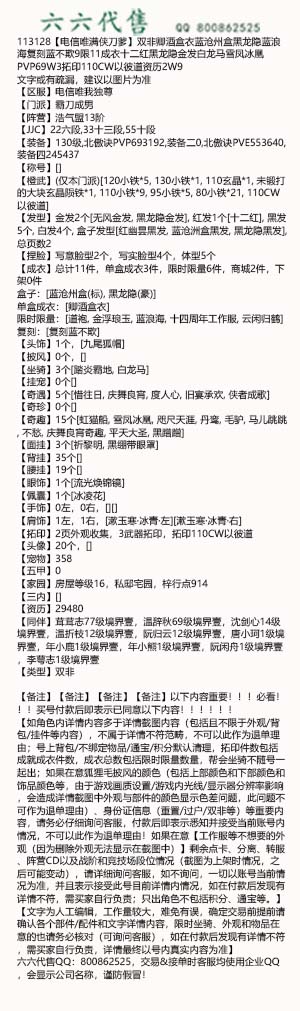 【如角色内详情内容多于详情截图内容(包括且不限于外观/背包/挂件等内容),不属于详情不符范畴,不可以此作为退单理由;号上背包/不绑定物品/通宝/积分默认清理,拓印件数包括成就成衣件数,成衣总数包括限时限量数量,帮会坐骑不随号一起出;如果在意狐狸毛披风的颜色(包括上部颜色和下部颜色和饰品颜色等,由于游戏画质设置/游戏内光线/显示器分辨率影响,会造成详情截图中外观与部件的颜色显示色差问题,此问题不可作为退单理由)、身份证信息(重置/过户/双非等)等重要内容,请务必仔细询问客服,付款后即表示悉知并接受当前账号内情况,不可以此作为退单理由!如果在意【工作服等不想要的外观(因为删除外观无法显示在截图中)】剩余点卡、分离、转服、阵营CD以及战阶和竞技场段位情况(截图为上架时情况,之后可能变动),请详细询问客服,如不询问,一切以账号当前情况为准,并且表示接受此号目前详情内情况,如在付款后发现有详情不符,需买家自行负责;只出角色不包括积分、通宝等。】