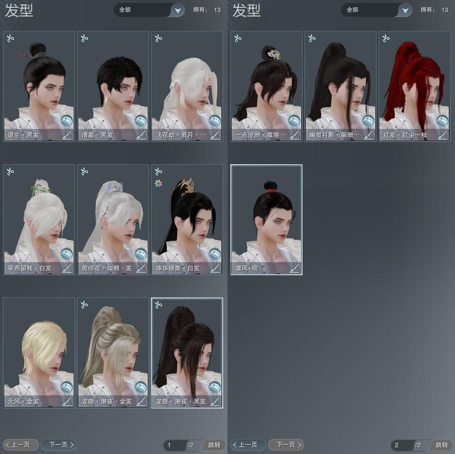 【发型】金发2个[无风金发, 黑龙隐金发], 红发1个[十二红], 黑发5个, 白发4个, 盒子发型[红幽昙黑发, 蓝沧洲盒黑发, 黑龙隐黑发], 总页数2