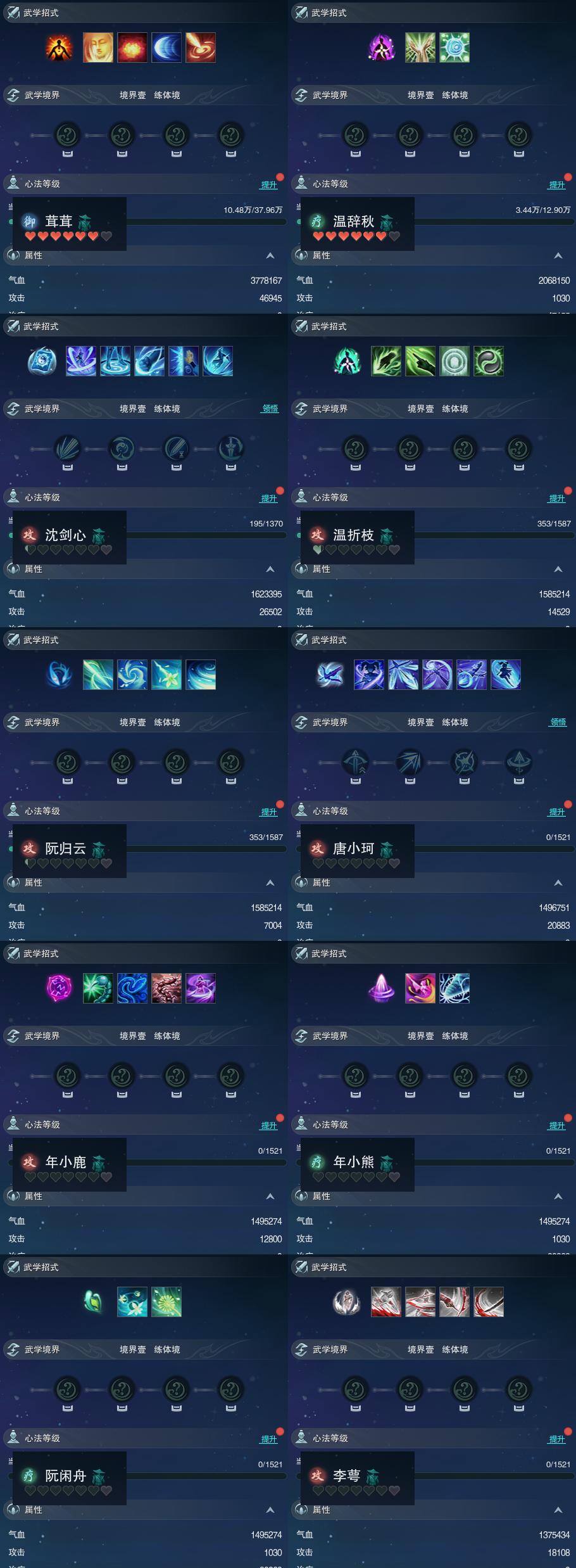 【同伴】茸茸志77级境界壹,温辞秋69级境界壹,沈剑心14级境界壹,温折枝12级境界壹,阮归云12级境界壹,唐小珂1级境界壹,年小鹿1级境界壹,年小熊1级境界壹,阮闲舟1级境界壹,李萼志1级境界壹