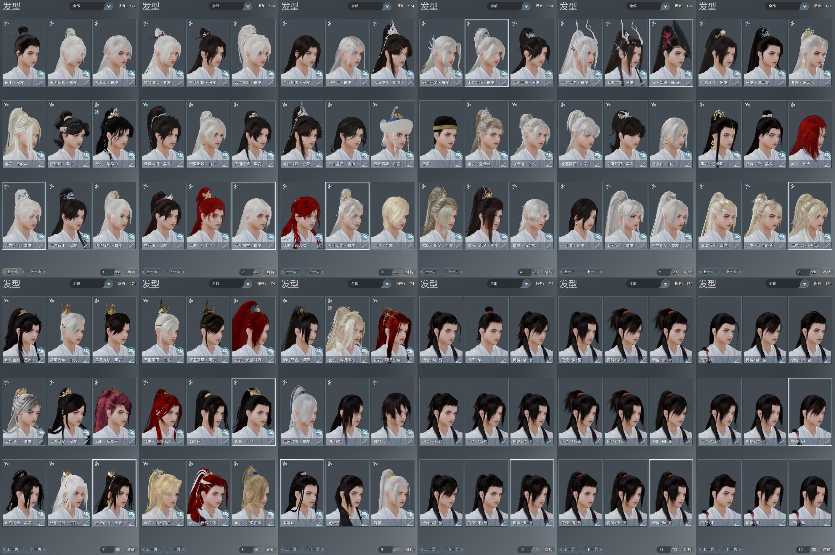【发型】金发10个[狐金, 资历金, 国金, 牛金, 三代金, 无风金发, 七中金发, 澄琼枝金发, 白游园金发, 白龙隐金发], 红发9个[八红, 九红, 紫发, 蝶粉, 猴红, 小资历红, 大资历红, 十五红, 蛇红], 黑发35个, 白发27个, 盒子发型[乘风黑发, 黑楼兰黑发, 飞皇黑发, 二代乘风黑发, 乘风白发, 黑楼兰白发, 飞皇白发, 二代乘风白发, 澄琼枝黑发, 小熊黑发, 花滑黑发, 花滑白发, 幽涧愀兮白发, 踏青黑发, 红黑妖眸盒黑发, 灵龙盒黑发, 踏青白发, 灵龙白发, 白龙隐黑发, 梦盒白发, 绿千山黑发, 九七白发, 彩陇西黑发, 白陇西黑发, 燕月盒黑发, 云掠霜峰白发, 燕月盒白发, 重花游黑发, 仙剑黑发, 潮涌盒黑发, 瓷盒黑发, 仙剑白发, 潮涌盒白发, 瓷盒白发], 总页数12