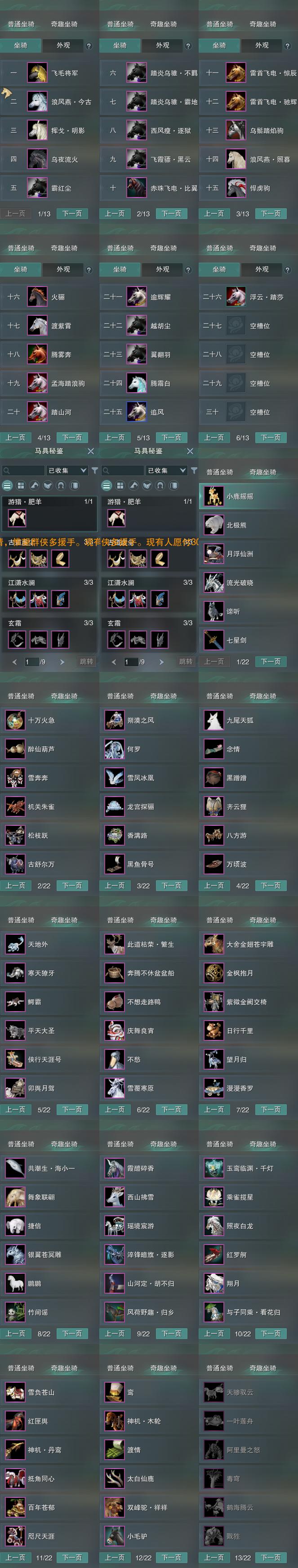 【坐骑】26个[踏炎不羁, 踏炎霸地, 赤珠比翼, 西风瘦逐狱, 飞毛将军, 飞霞骠黑云, 挥戈明影, 浪风燕今古, 霸红尘, 雷首飞电惊辰, 雷首飞电驰辉, 乌鬃踏焰驹]