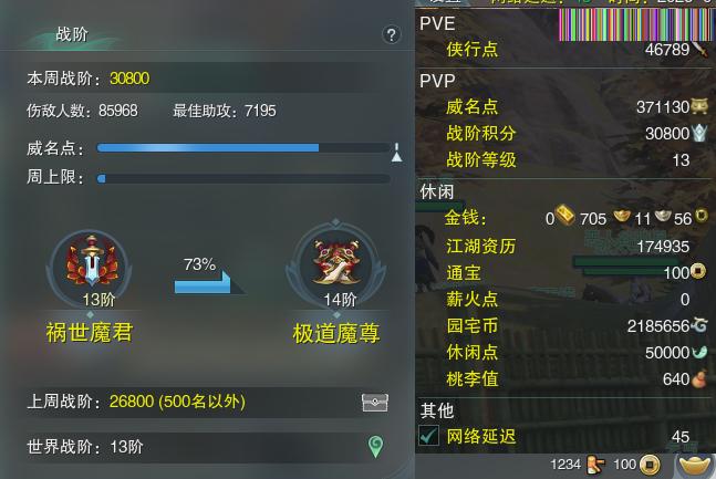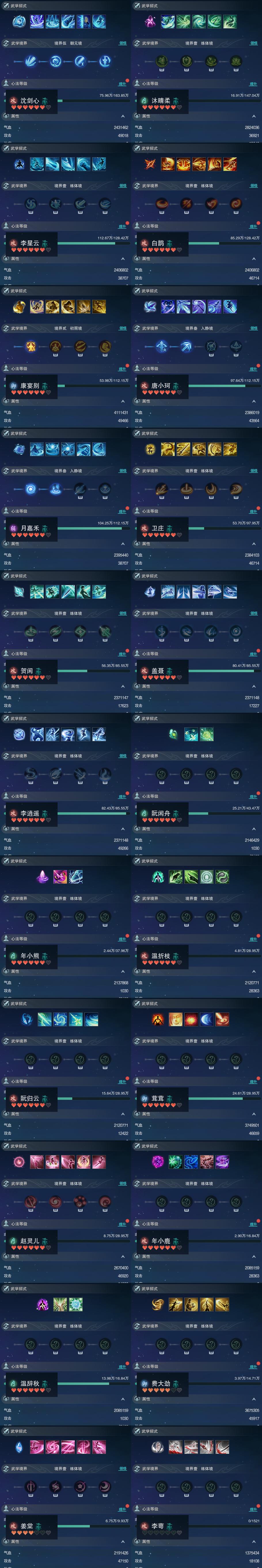 【同伴】沈剑心89级境界伍,沐晴柔87级境界壹,李星云86级境界壹,白鹊志86级境界壹,康宴别85级境界贰,唐小珂85级境界叁,月嘉禾85级境界叁,卫庄志84级境界壹,贺闲志83级境界壹,盖聂志83级境界壹,李逍遥83级境界壹,阮闲舟78级境界壹,年小熊77级境界壹,温折枝75级境界壹,阮归云75级境界壹,茸茸志75级境界壹,赵灵儿75级境界壹,年小鹿71级境界壹,温辞秋71级境界壹,费大劲70级境界壹,姜棠志67级境界壹,李萼志1级境界壹