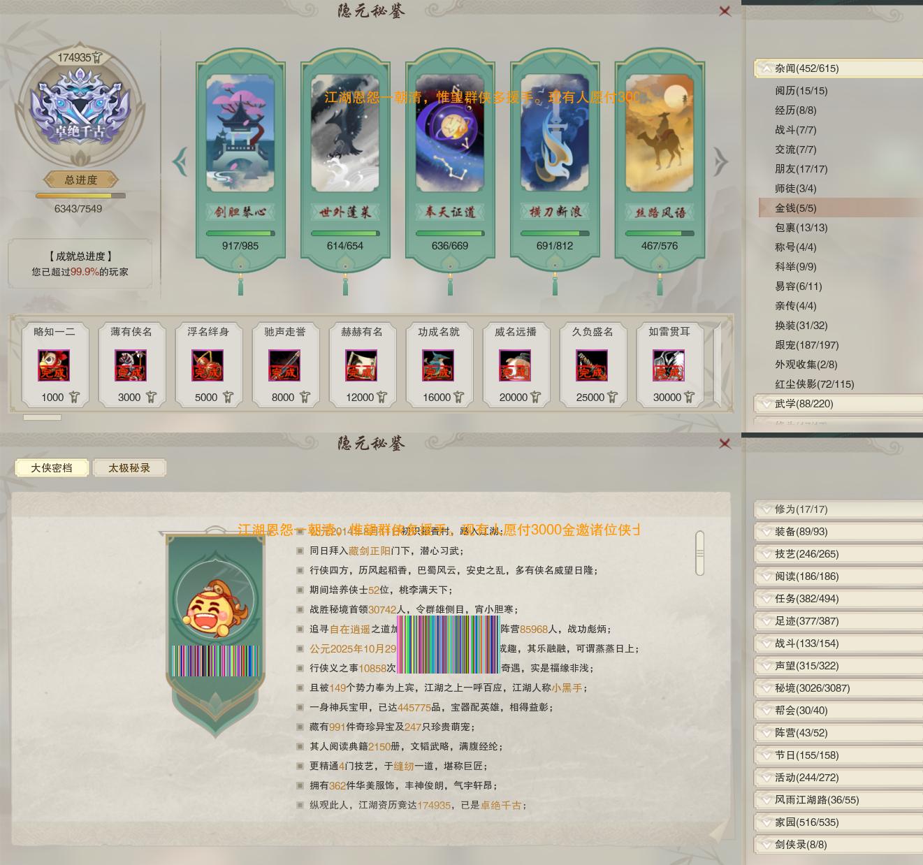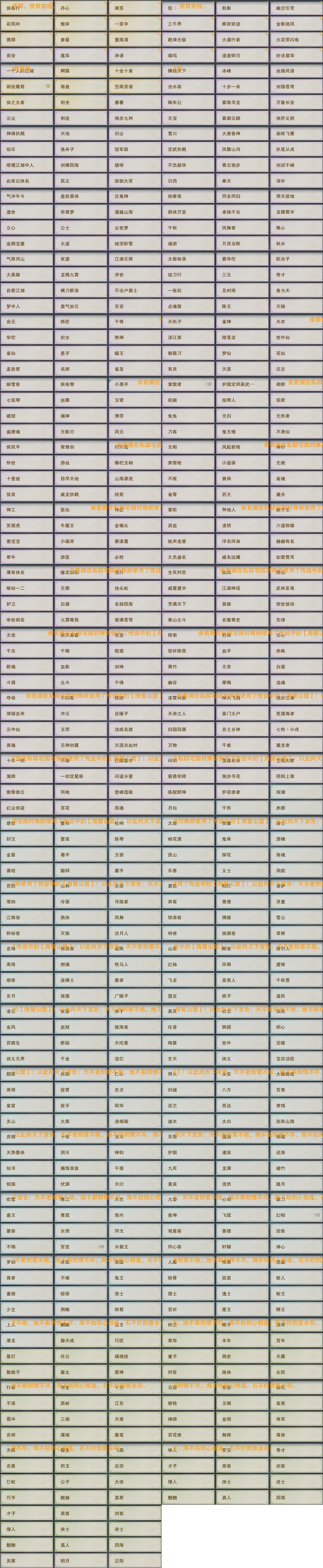 【奇遇】45个[白日梦, 天涯无归, 三山四海, 劝学记, 雪山恩仇, 阴阳两界, 兔江湖, 平生心愿, 黑白路, 惜往日, 乱世舞姬, 塞外宝驹, 争铸吴钩, 韶华故, 虎啸山林, 济苍生, 护佑苍生, 少年行, 故园风雨, 扶摇九天, 三尺青锋, 流年如虹, 舞众生, 清风捕王, 侠行囧途, 寻猫记, 茶馆奇缘, 入蛟宫, 庆舞良宵, 万灵当歌]