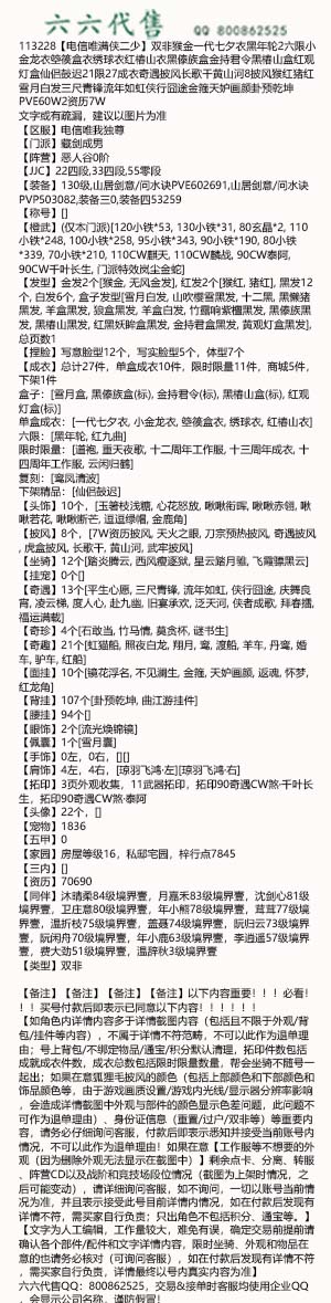 【如角色内详情内容多于详情截图内容(包括且不限于外观/背包/挂件等内容),不属于详情不符范畴,不可以此作为退单理由;号上背包/不绑定物品/通宝/积分默认清理,拓印件数包括成就成衣件数,成衣总数包括限时限量数量,帮会坐骑不随号一起出;如果在意狐狸毛披风的颜色(包括上部颜色和下部颜色和饰品颜色等,由于游戏画质设置/游戏内光线/显示器分辨率影响,会造成详情截图中外观与部件的颜色显示色差问题,此问题不可作为退单理由)、身份证信息(重置/过户/双非等)等重要内容,请务必仔细询问客服,付款后即表示悉知并接受当前账号内情况,不可以此作为退单理由!如果在意【工作服等不想要的外观(因为删除外观无法显示在截图中)】剩余点卡、分离、转服、阵营CD以及战阶和竞技场段位情况(截图为上架时情况,之后可能变动),请详细询问客服,如不询问,一切以账号当前情况为准,并且表示接受此号目前详情内情况,如在付款后发现有详情不符,需买家自行负责;只出角色不包括积分、通宝等。】